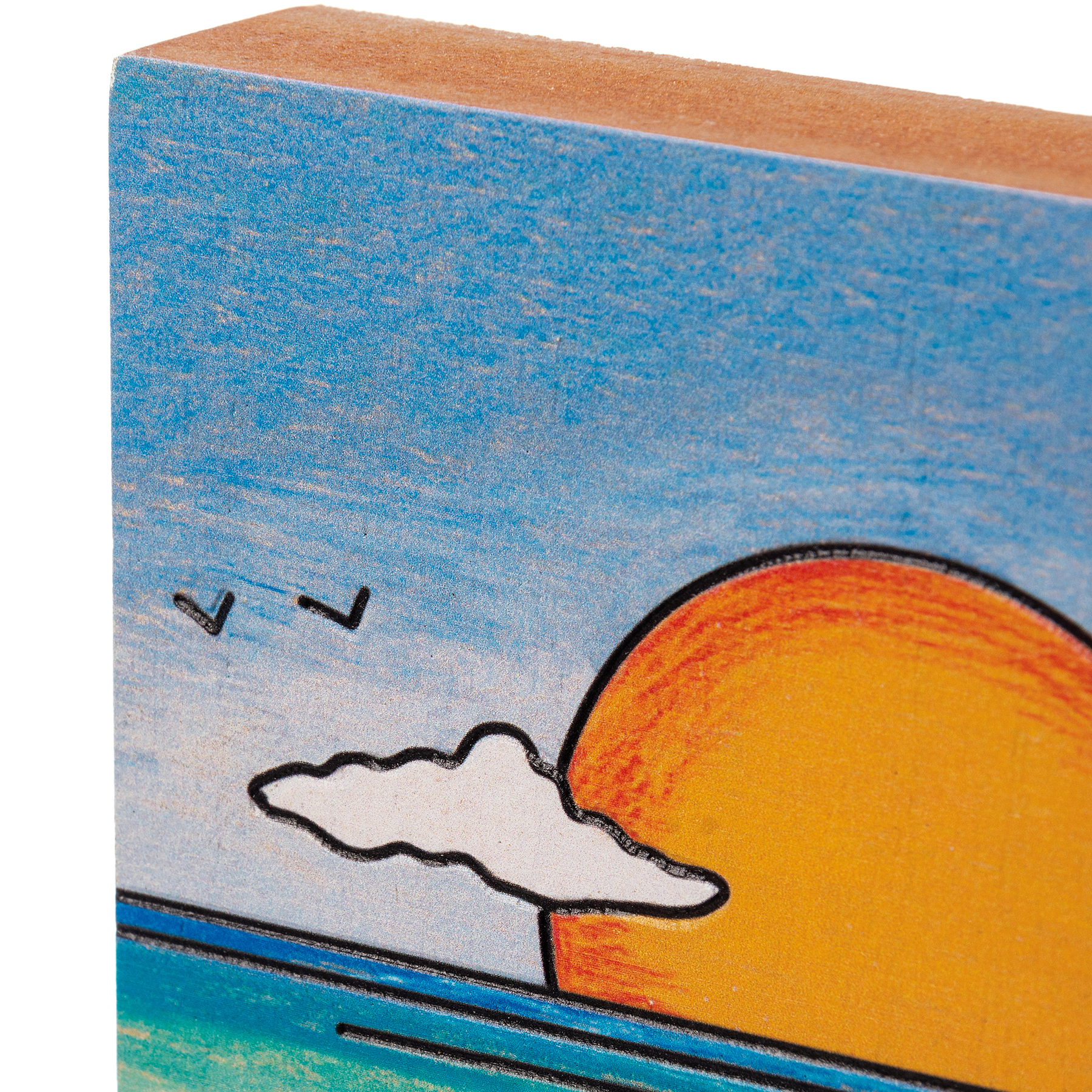 A wooden block sign from our Beach Collection features "Our Happy Place" sentiment with vibrant wood burned beach scene design. Natural wood sides make the design pop. Our Happy Place block sign is easy to hang via predrilled keyhole slot or can free-stand alone.