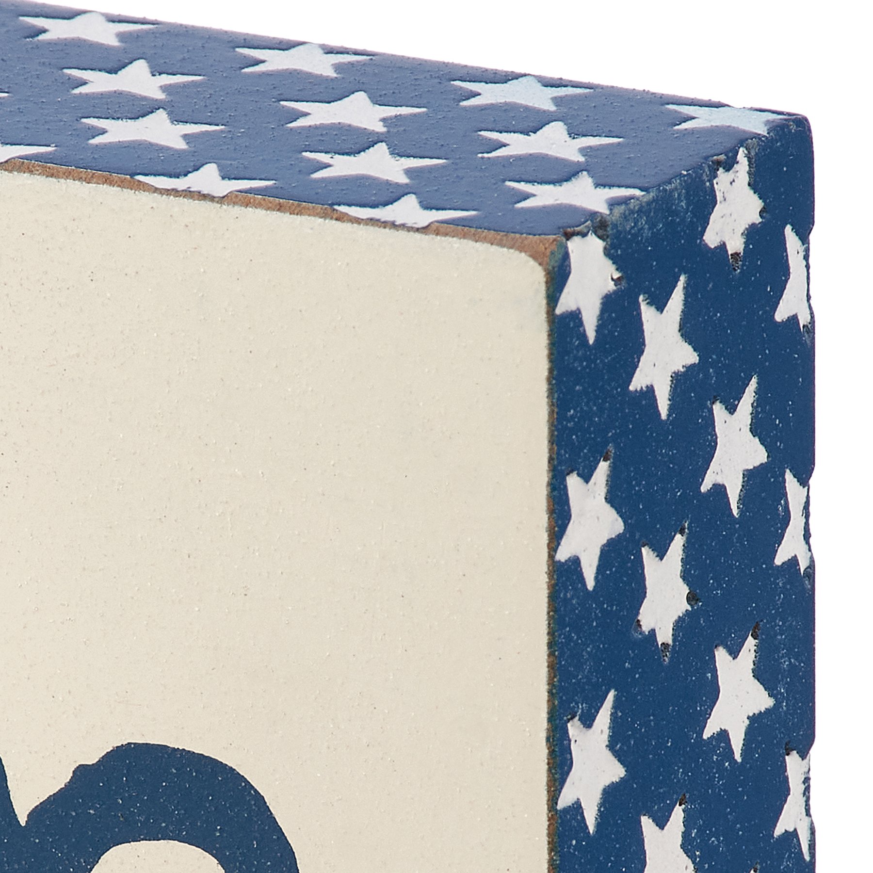 A rustic wooden block sign from our Patriotic Collection displaying "Veteran Proudly Served With Honor" sentiment in patriotic blue color. Sides feature debossed white star designs on blue for added texture. Our Veteran Served With Honor block sign is easy to hang via predrilled keyhole slot or can free-stand alone.