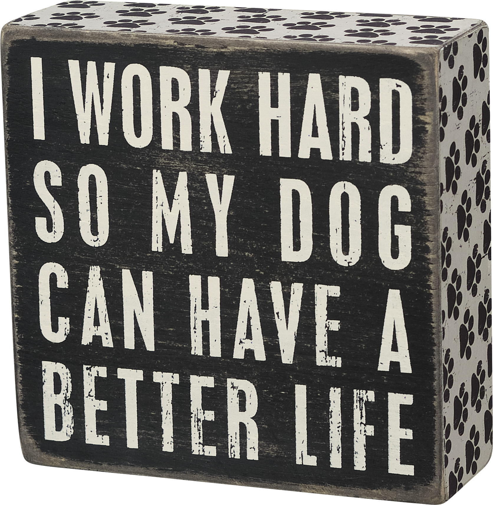 A classic black and white wooden box sign featuring a distressed "I Work Hard So My Dog Can Have A Better Life" sentiment with paw print trim designs. Our Dog Better Life box sign is easy to hang or can free-stand alone.