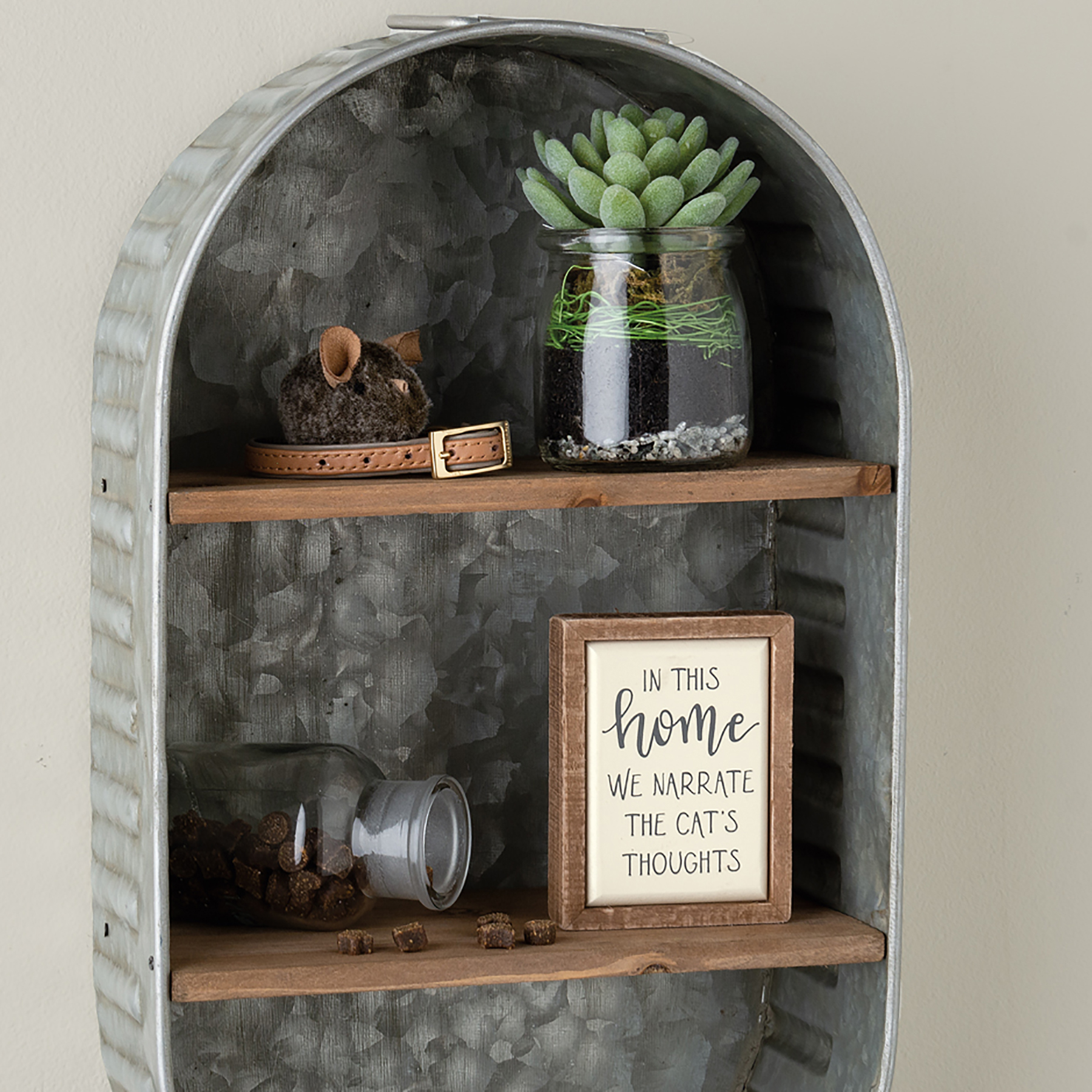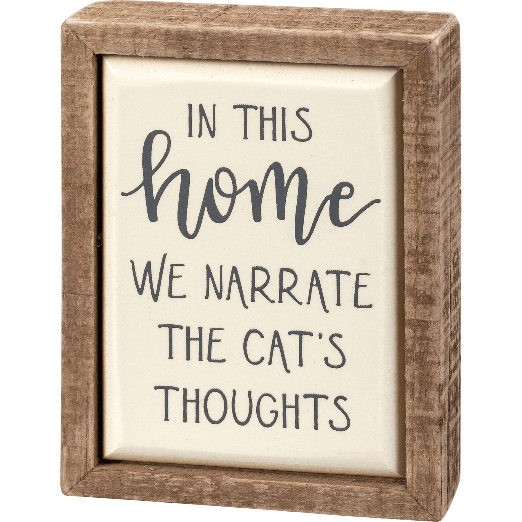 A wooden box sign mini from our Pet Collection featuring a hand lettered "In This Home We Narrate The Cat's Thoughts" sentiment and faux enamel finish for tile-like appearance. Our Narrate The Cat's Thoughts box sign mini is easy to hang or can free-stand alone.