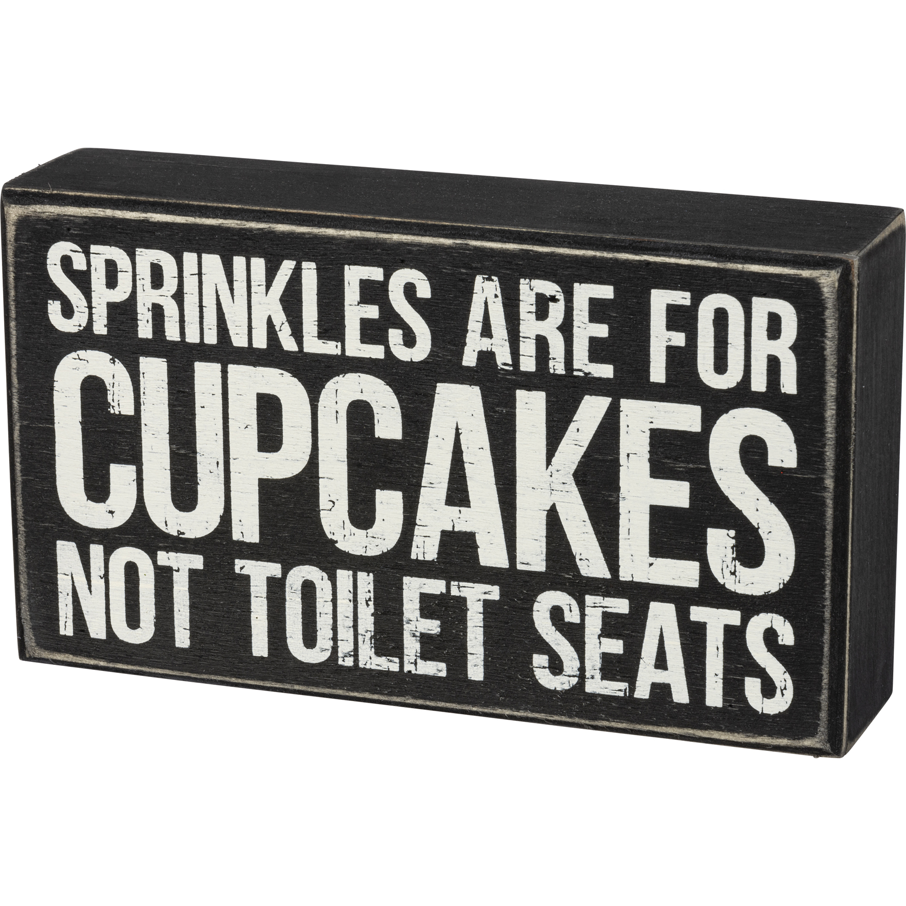 A classic black and white box sign featuring "Sprinkles Are For Cupcakes Not Toilet Seats" sentiment. Easy to hang or can free-stand alone.
