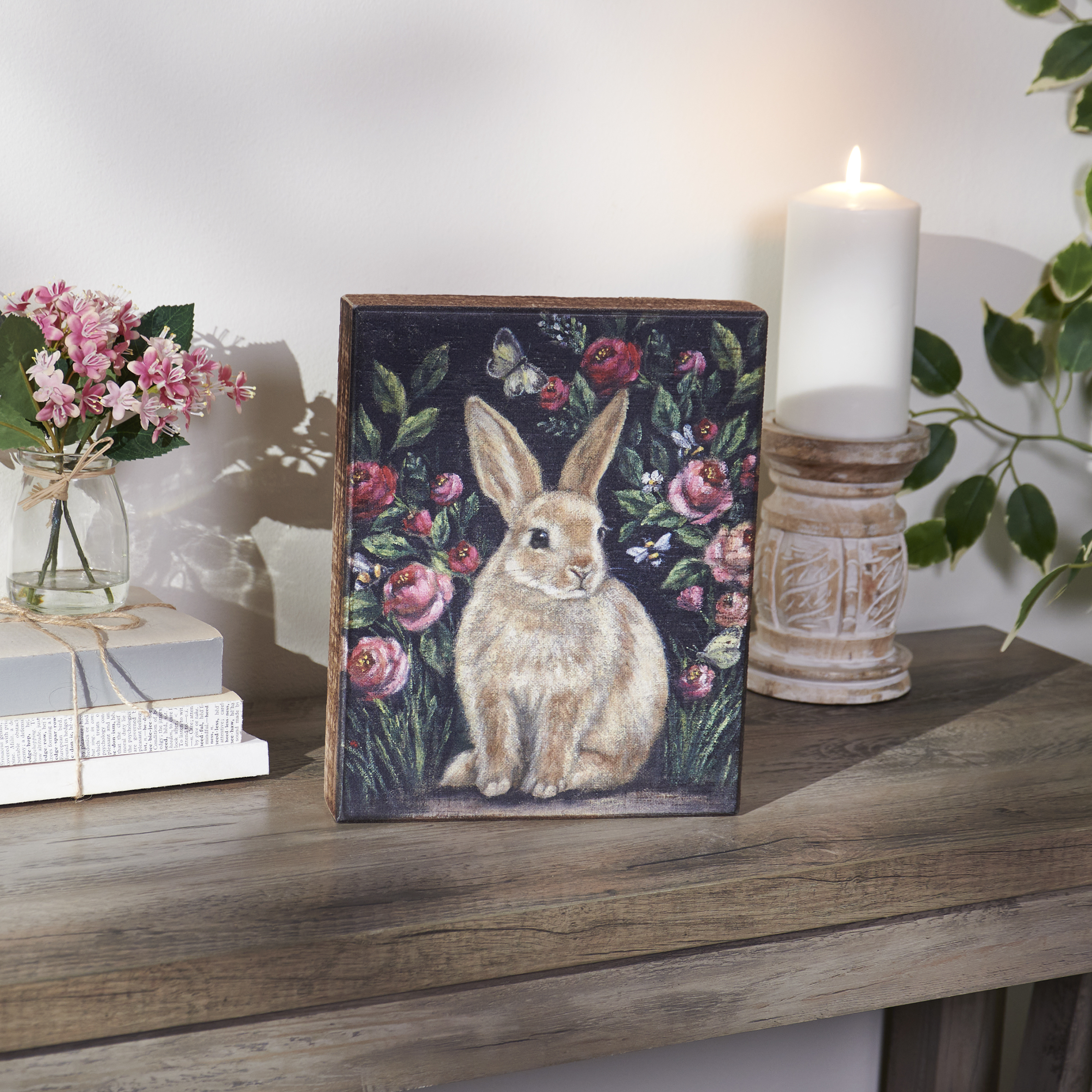 A charming wooden box sign from our Easter & Spring Collection displaying a calming scene of a bunny sitting in spring flowers in a moody color palette. Design is replicated from original artwork painted onto burlap canvas, giving the art a unique depth and texture. Box sign features distressed details with coordinating natural wood on the sides and back. Our Woodland Bunny box sign is easy to hang or can free-stand alone. A rustic everyday home accent with a variety of display options.