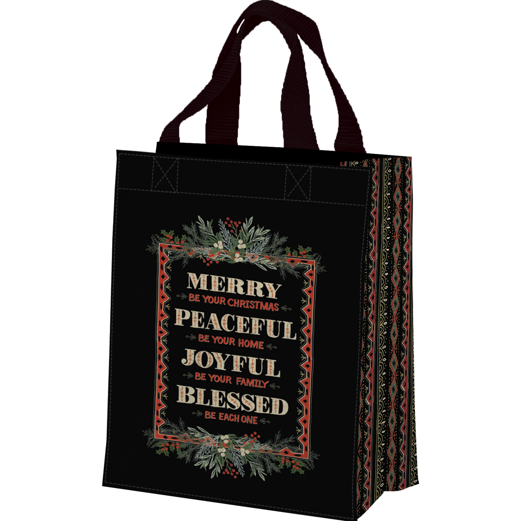 A daily tote bag featuring a double-sided "Merry Be Your Christmas Peaceful Be Your Home Joyful Be Your Family Blessed Be Each One" sentiment and Christmas greenery designs in a luxe holiday palette. Gussets feature complementing patterns. Contains dual hand straps for easy carrying.