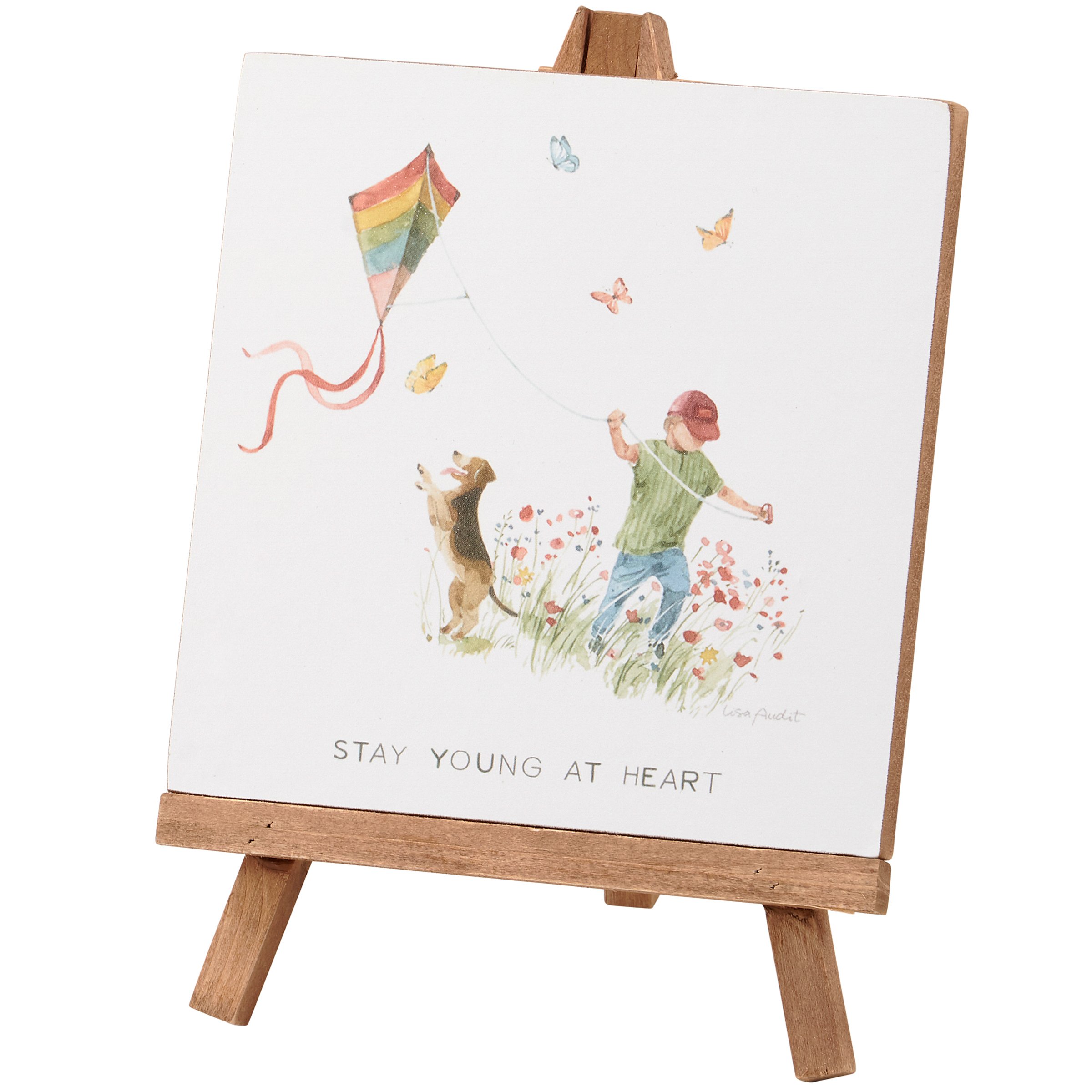 An easel décor piece from our Watercolor Collection featuring a mini easel holding an attached wooden art panel replicating a canvas. Art panel displays a charming scene of a dog and a child playing with a kite above an inspirational sentiment that reads "Stay Young At Heart." Design is replicated from original art hand painted in a delicate watercolor style. Our Stay Young At Heart easel is ready to display without assembly using the stand and attached ribbon. Packaged in a kraft paper box with acrylic lid to easily view displayed art. An inspirational everyday home accent great for gifting that can be easily displayed in any home or work space.