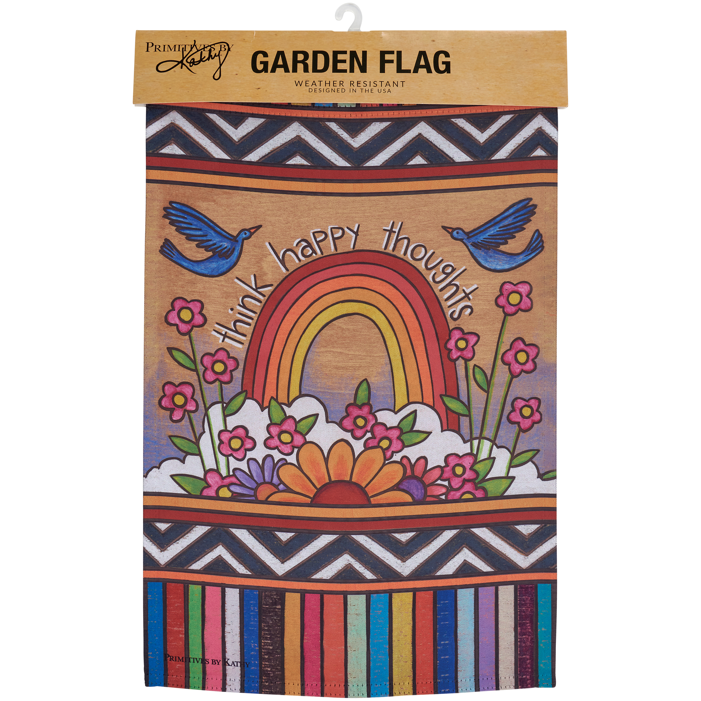 A double-sided polyester garden flag from our Wood Burning Collection displaying a colorful design of a rainbow, flowers, and birds with complementing geometric patterns and an inspirational sentiment that reads "Think Happy Thoughts." Design is replicated from original hand illustrated art with wood burned details. Garden flag is weather-resistant and features an opening to hang on our Garden Flag Pole. Our Happy Thoughts garden flag is packaged with a header card and hook to easily hang on rack. Hand wash only. An inspirational home accent perfect for everyday display in any yard or garden.