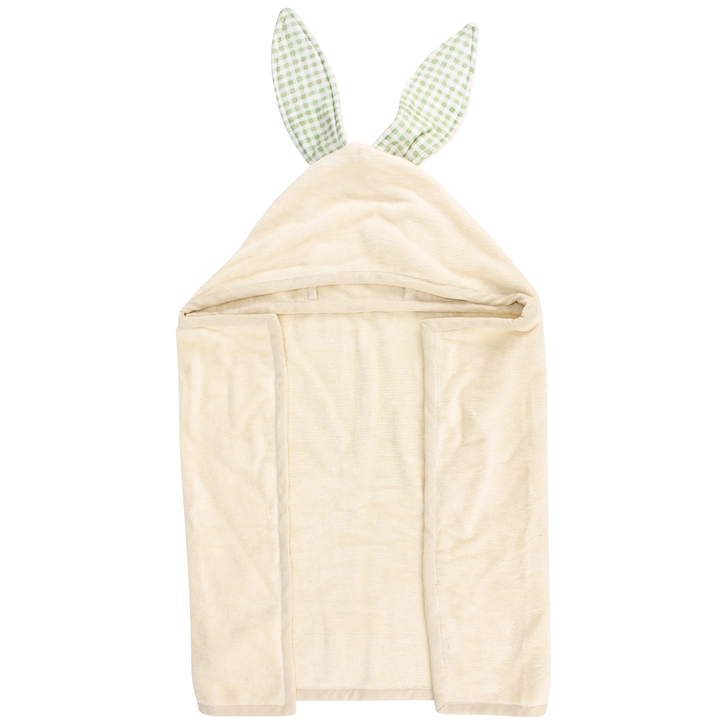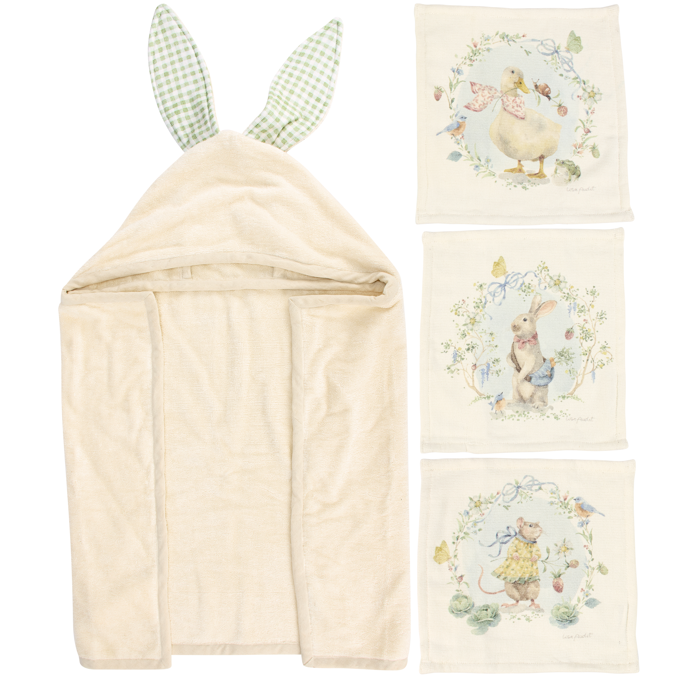 A cotton towel set from our Baby & Kids Collection that includes a children's hooded bath towel and three washcloths displaying coordinating garden animal designs inspired by children's storybook illustrations. Garden designs are replicated from original art hand painted in a delicate watercolor style. Children's hooded towel features absorbent terrycloth and an attached hood with bunny ear accents displaying a green gingham pattern. Washcloths display all-over designs on the front of each including a rabbit, duck, and mouse. Our Garden Friends hooded towel set is conveniently machine washable for easy cleaning. Towel set is neatly packaged together with cotton tape displaying towel ears and washcloth designs as well as a product information card making it great for gifting. Recommended for ages 0-24 months. A cute garden-themed gift set perfect for baby showers or everyday moments.