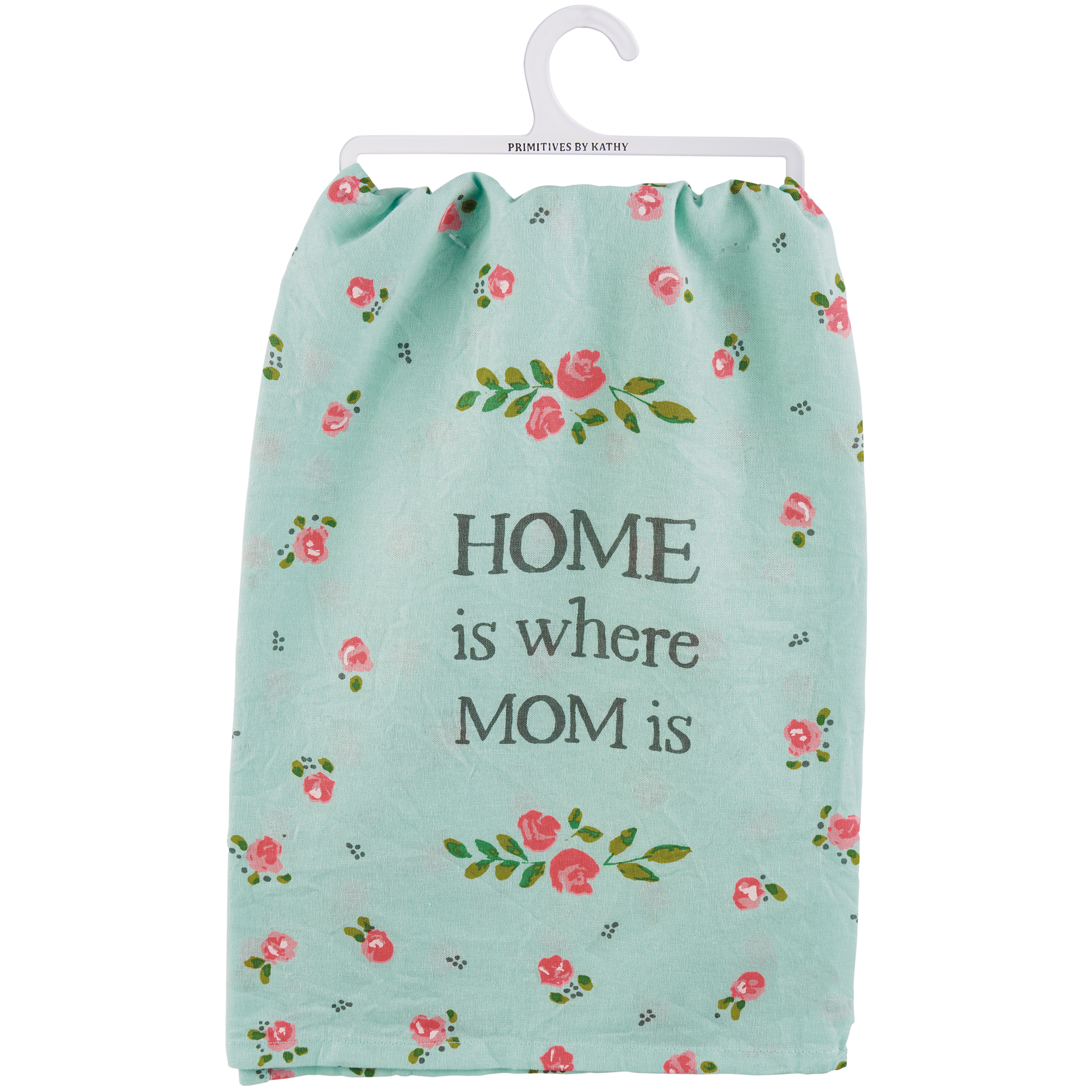 A mint green cotton kitchen towel from our Mother's Day Collection displaying an all-over print of charming watercolor flowers with a hand illustrated "Home Is Where Mom Is" sentiment. Our Home Is Where Mom Is kitchen towel is machine-washable for convenient cleaning. Packaged on a plastic hanger with hook to easily hang on rack.