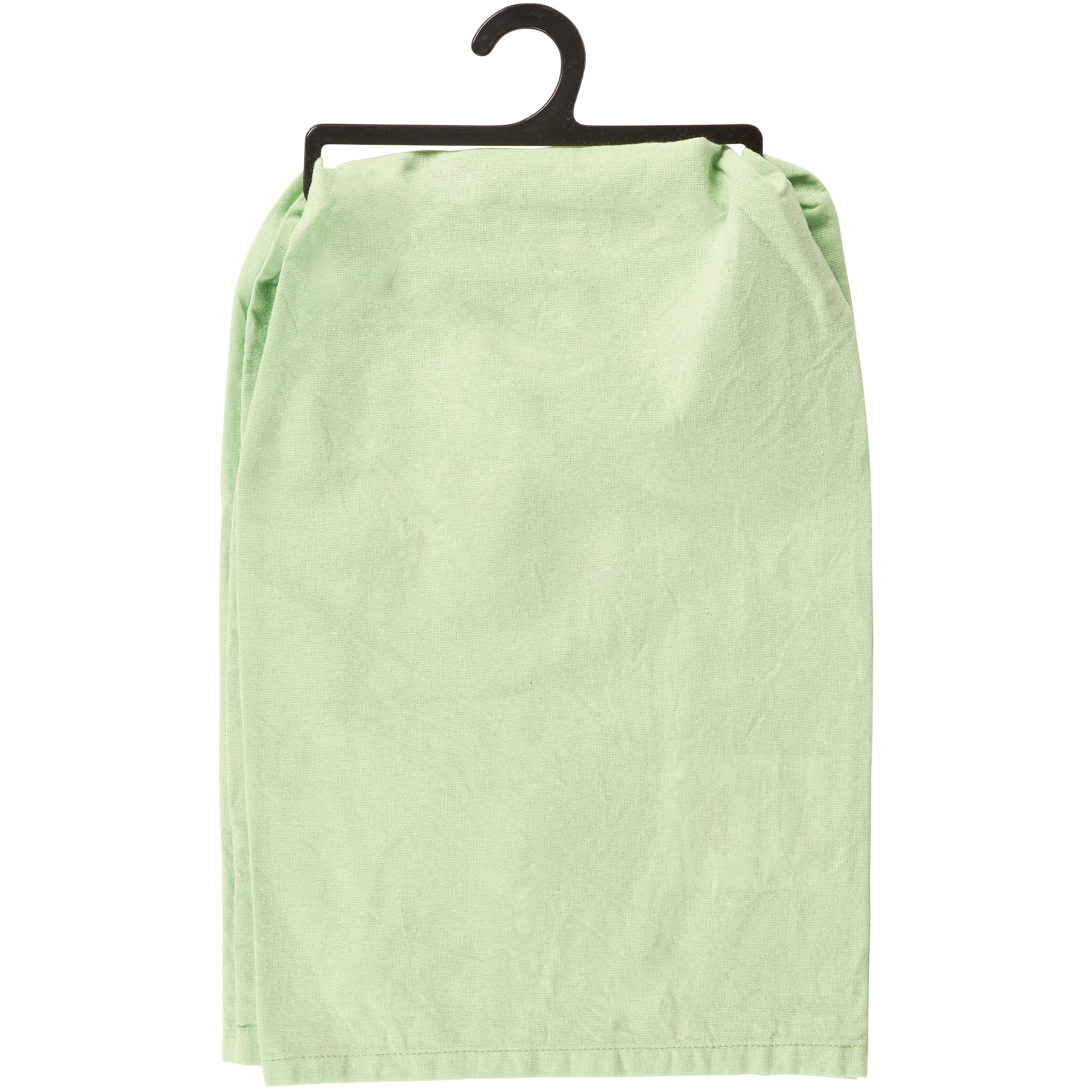 A green cotton kitchen towel from our St. Patrick's Day Collection displaying a unique hand illustrated design of shamrocks and a pot of gold with a seasonal sentiment that reads "May Your Troubles Be Less And Your Blessings Be More And Nothing But Happiness Come Through Your Door." Our Irish Blessing kitchen towel is conveniently machine-washable for easy cleaning. Packaged on a black plastic hanger to easily display on rack. An inspirational St. Patrick's Day gift perfect for a seasonal kitchen accessory.