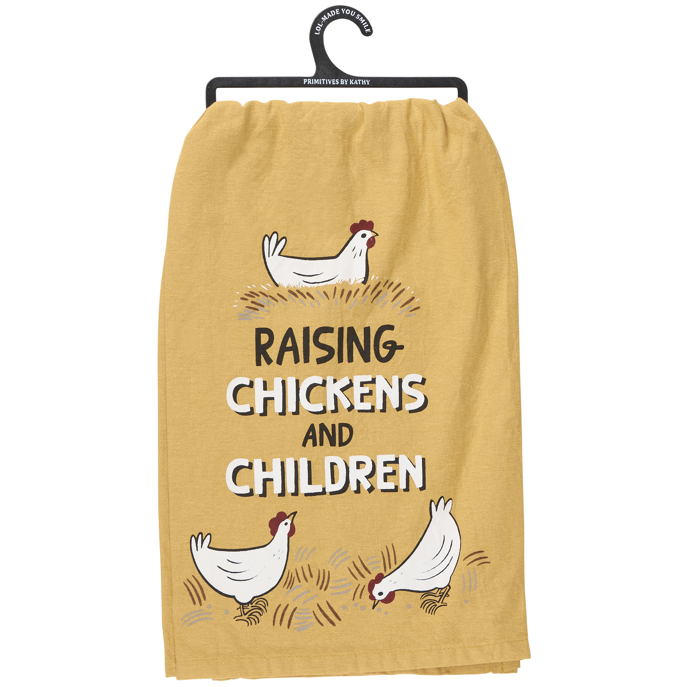 A yellow cotton kitchen towel from our Homestead Collection displaying a fun design of chickens and a homestead inspired sentiment with unique hand illustrated details. Sentiment reads "Raising Chickens And Children." Our Raising Chickens kitchen towel is conveniently machine-washable for easy cleaning. Packaged on a black plastic hanger to easily display on rack. A fun homestead-themed kitchen accessory perfect for everyday use.