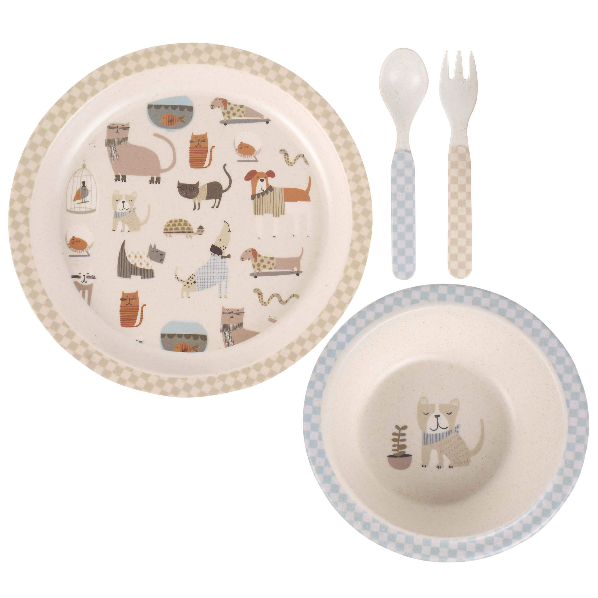 A giftable meal set from our Baby & Kids Collection including a bowl, plate, cup, fork, and spoon displaying charming pet inspired designs replicated from original block print style art. Our Pets meal set is BPA-free, thoughtfully made with bamboo and melamine. Each item in the meal set is conveniently dishwasher safe for easy cleaning. Not microwave safe. Meal set is packaged in a high-quality kraft paper box displaying all items making it great for gifting and easy store display. A cute pet-themed gift perfect for everyday use.