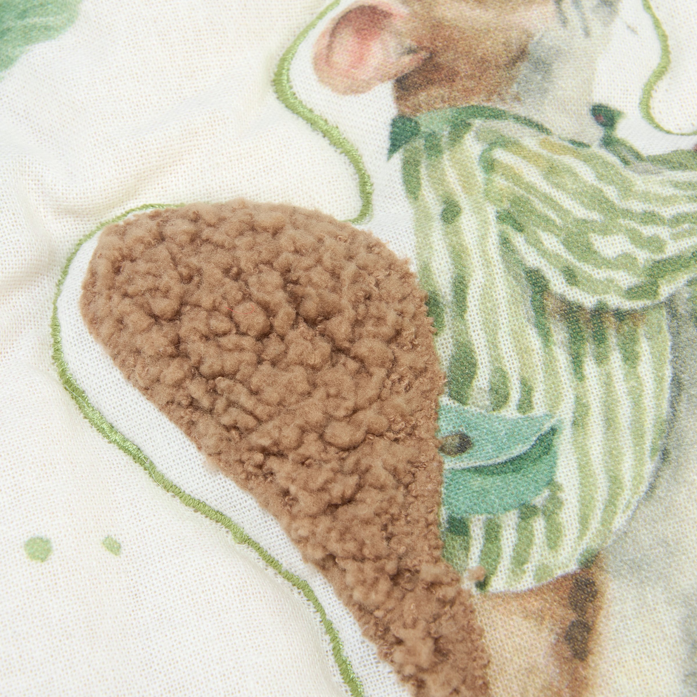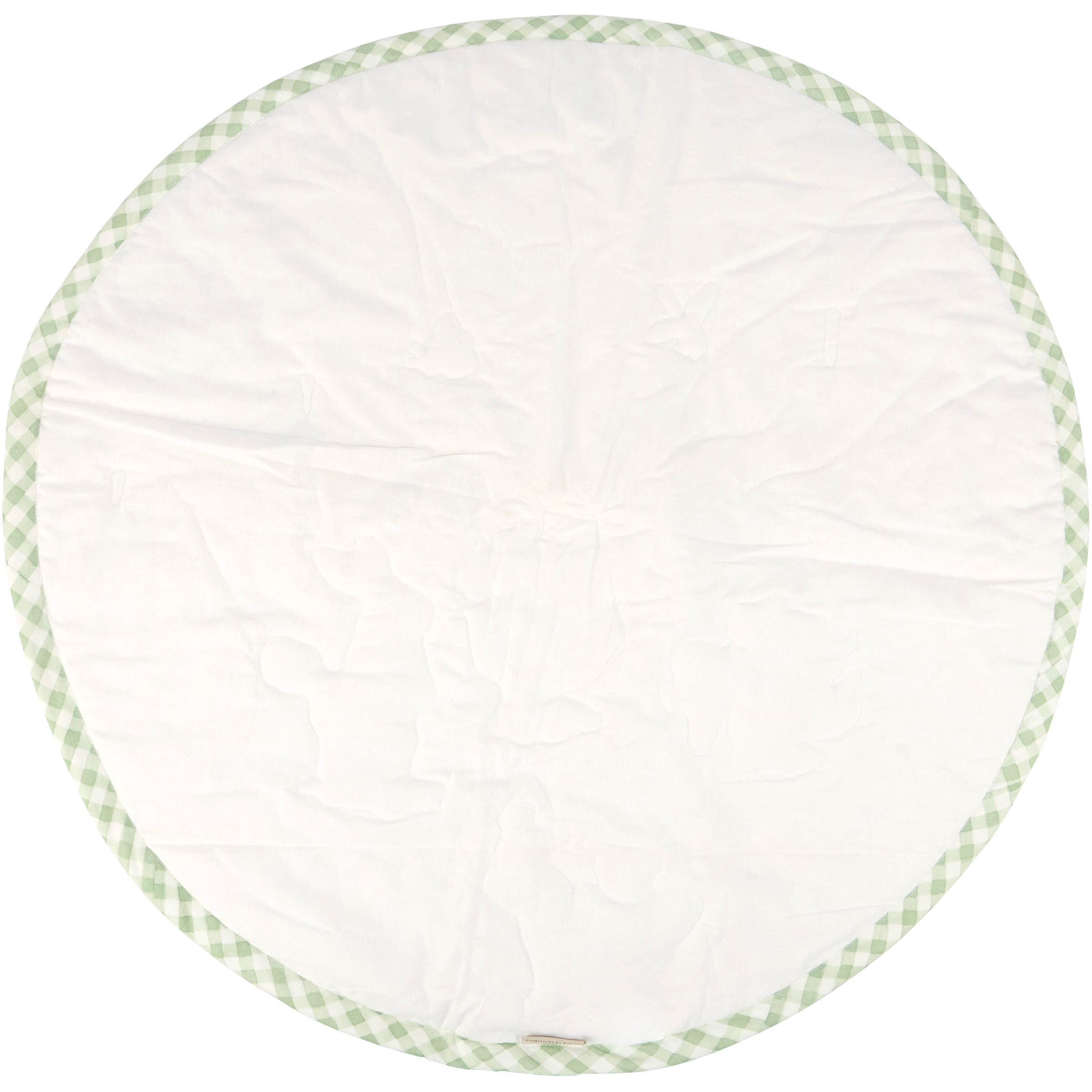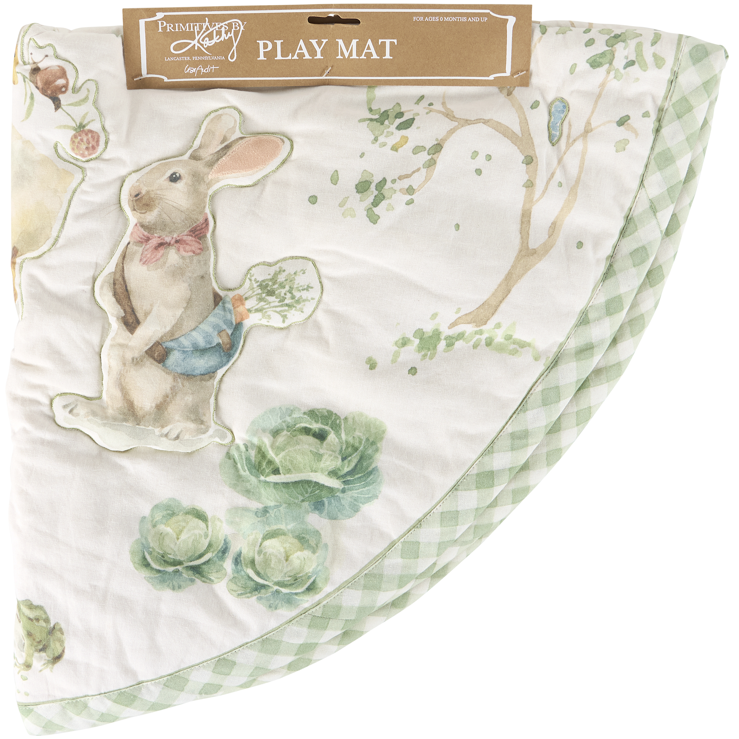 A cotton playmat from our Baby & Kids Collection displaying a charming design of garden animals inspired by children's storybook illustrations. Garden animal designs are replicated from original art hand painted in a delicate watercolor style. Our Garden Friends play mat features engaging sensory elements including crinkle paper, velvet, squeaker, and faux fur to encourage touch and play perfect for ages 6 months and up. Child play mat is folded and packaged on a header card with hole for easy store rack display. A cute garden-themed gift for baby showers or everyday moments.