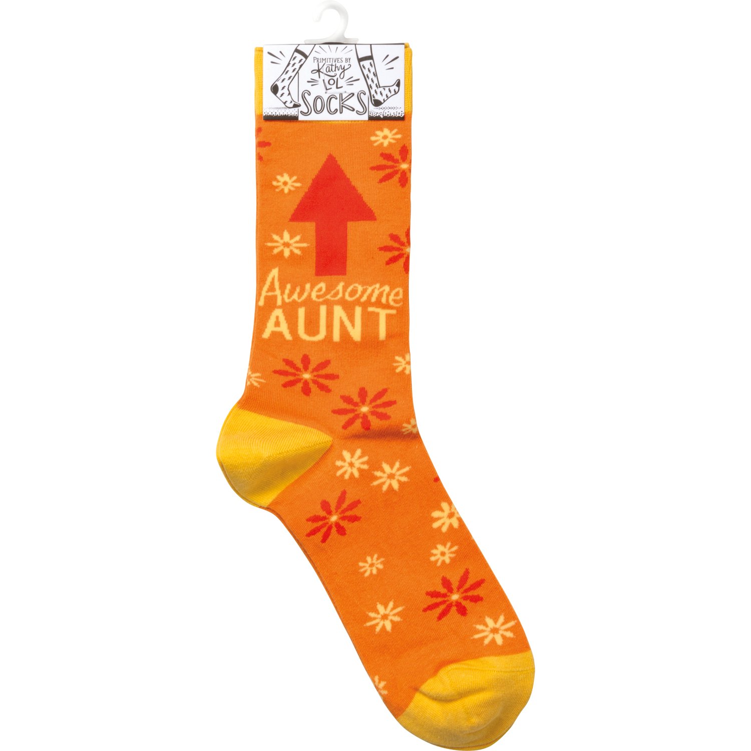 These colorful socks from our LOL Made You Smile Collection feature woven designs with coordinating "Awesome Aunt" sentiment. Cotton, nylon, spandex. These awesome aunt socks are one size fits most.