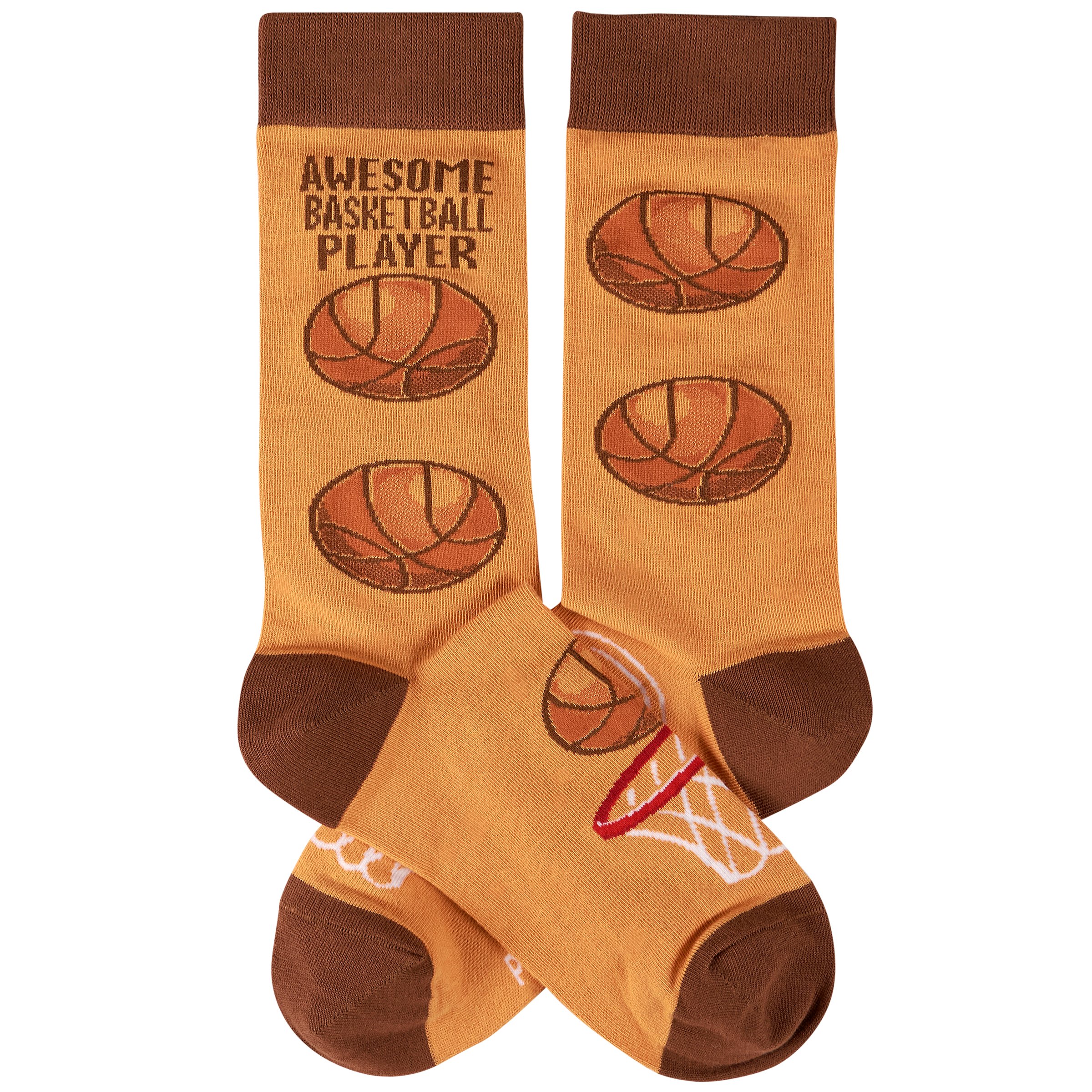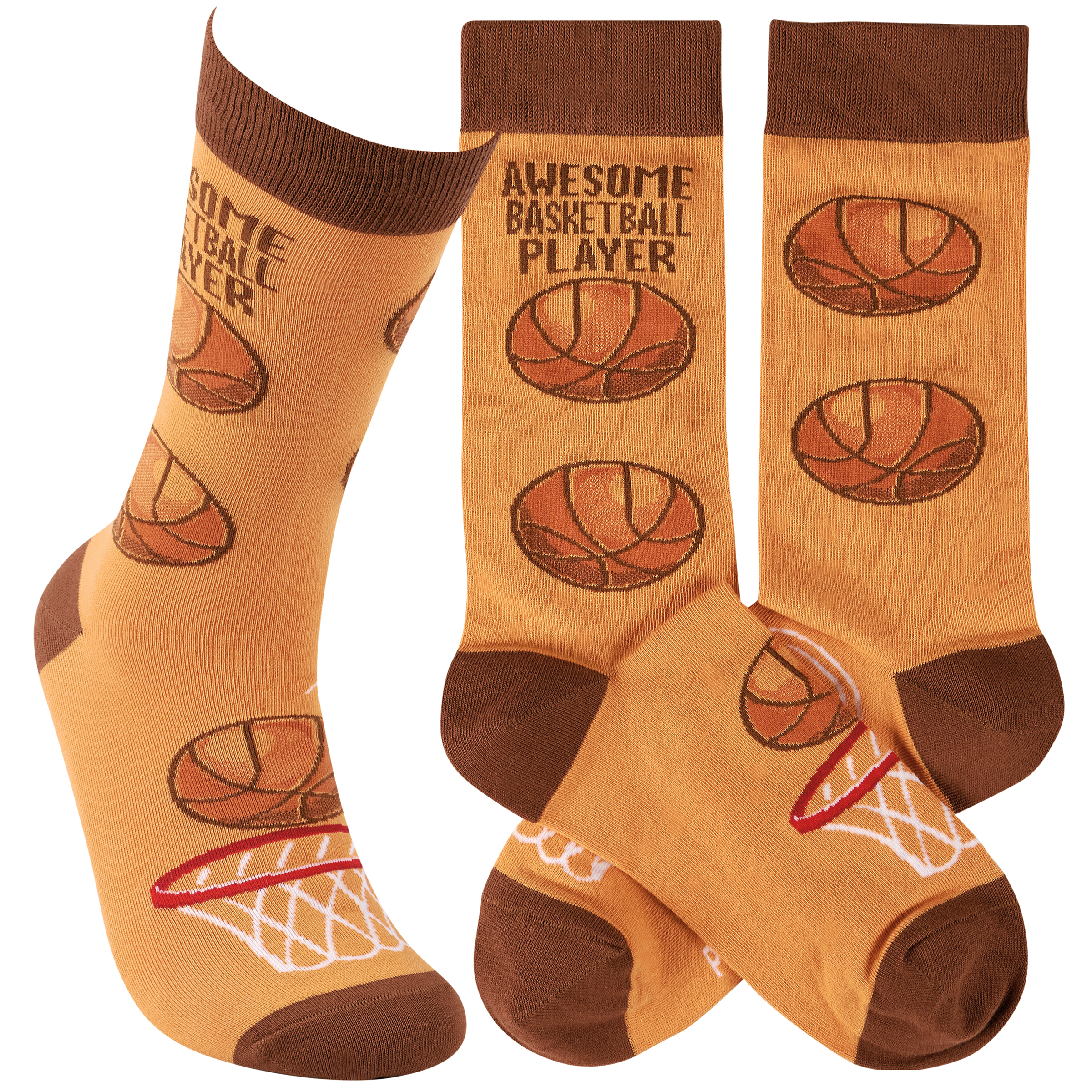 A pair of colorful socks from our LOL-Made You Smile Collection displaying playful hand illustrated designs of basketballs and basketball net with a fun sports inspired sentiment that reads "Awesome Basketball Player." These giftable socks are made with a cotton, nylon, and spandex blend for a one size fits most design. Our Awesome Basketball Player socks come with a decorative header card and a clear plastic hanger for easy rack display and gifting. A fun basketball-themed gift perfect for everyday self-expression.