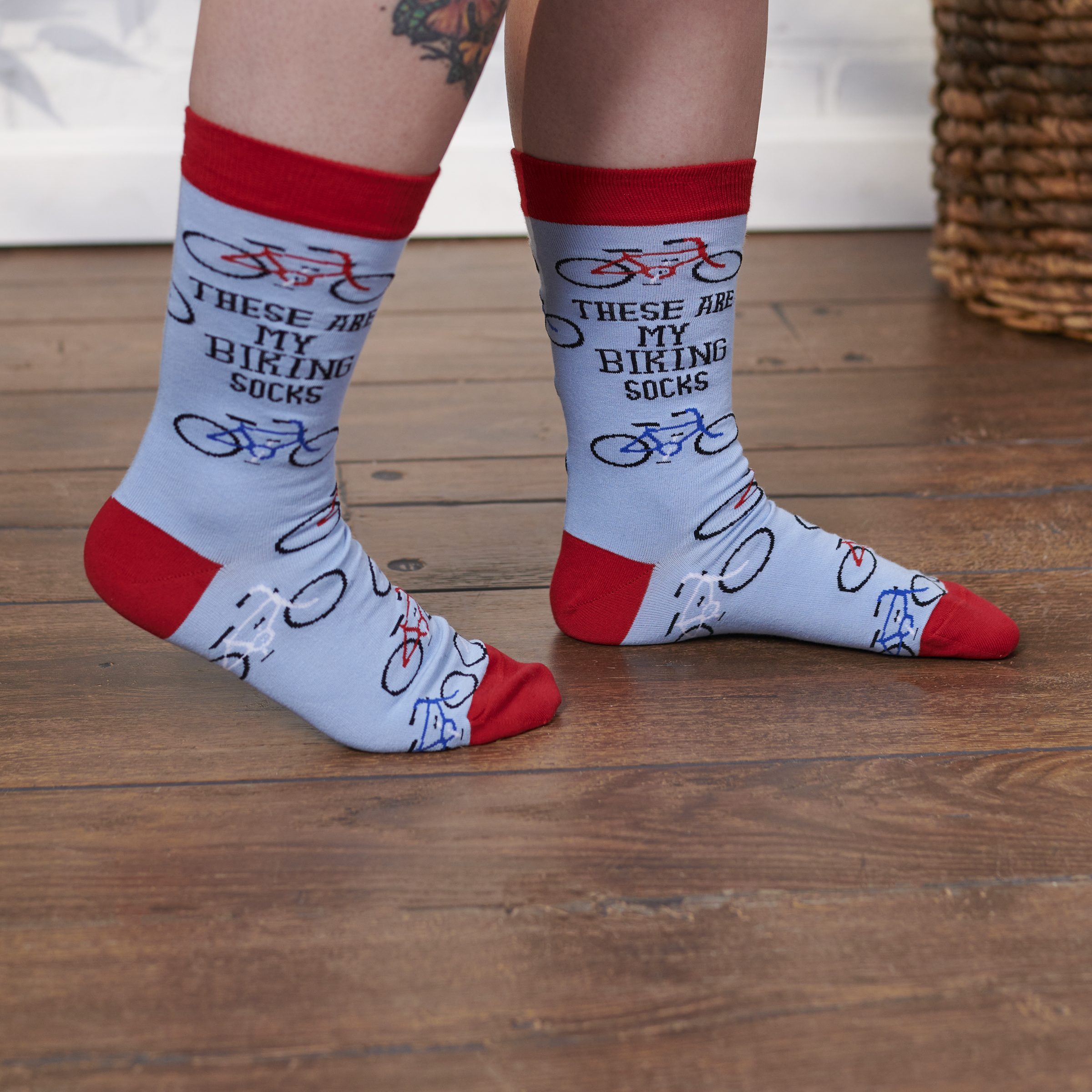These colorful socks from our LOL Made You Smile Collection feature woven designs with coordinating "These Are My Biking Socks" sentiment. Cotton, nylon, spandex. These funny biking socks are one size fits most.