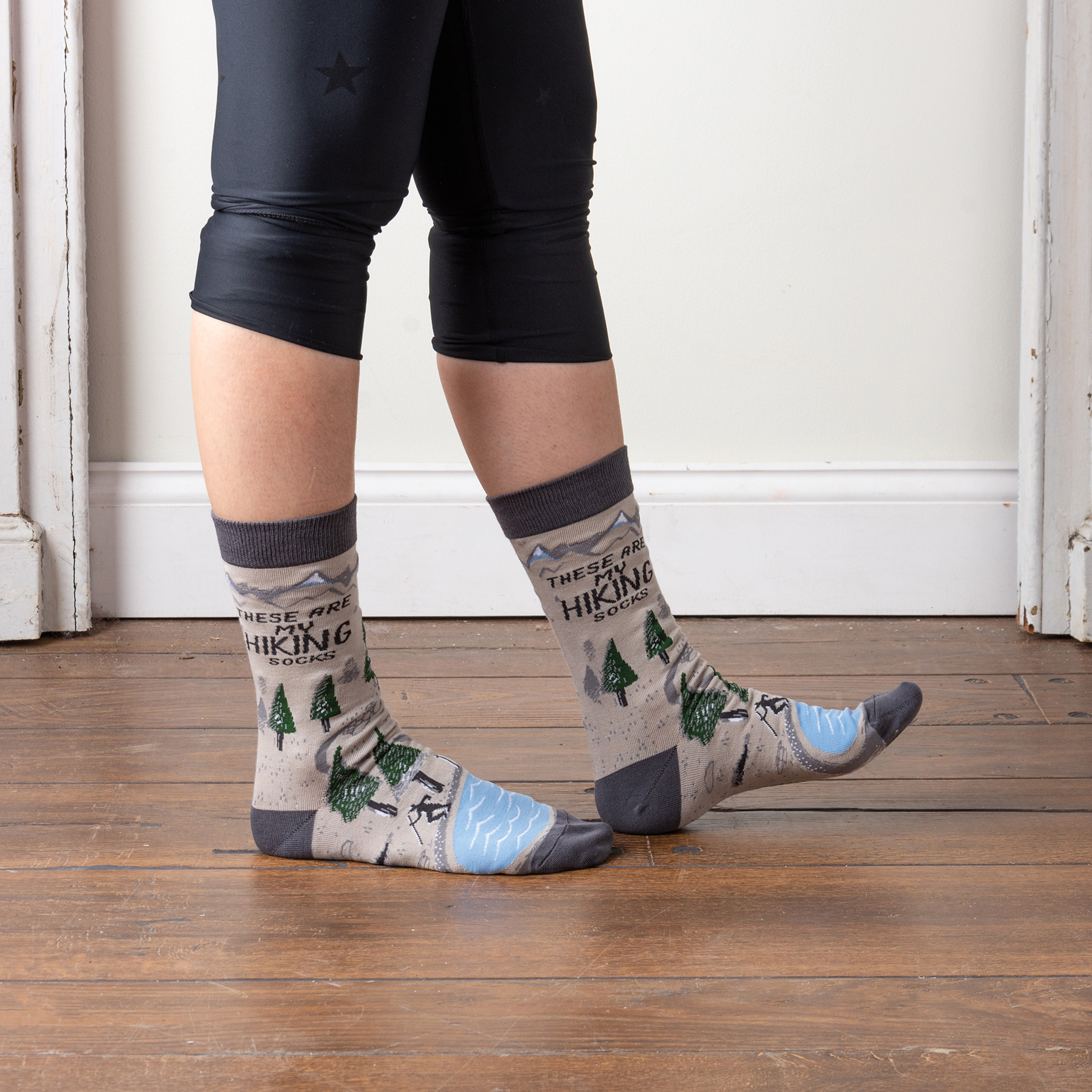 These colorful socks from our LOL Made You Smile Collection feature woven designs with coordinating "These Are My Hiking Socks" sentiment. Cotton, nylon, spandex. These funny hiling socks are one size fits most.