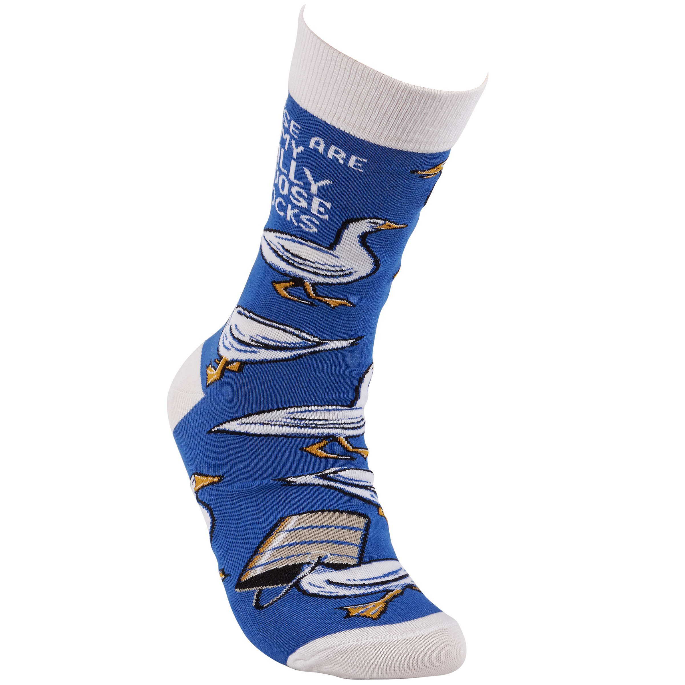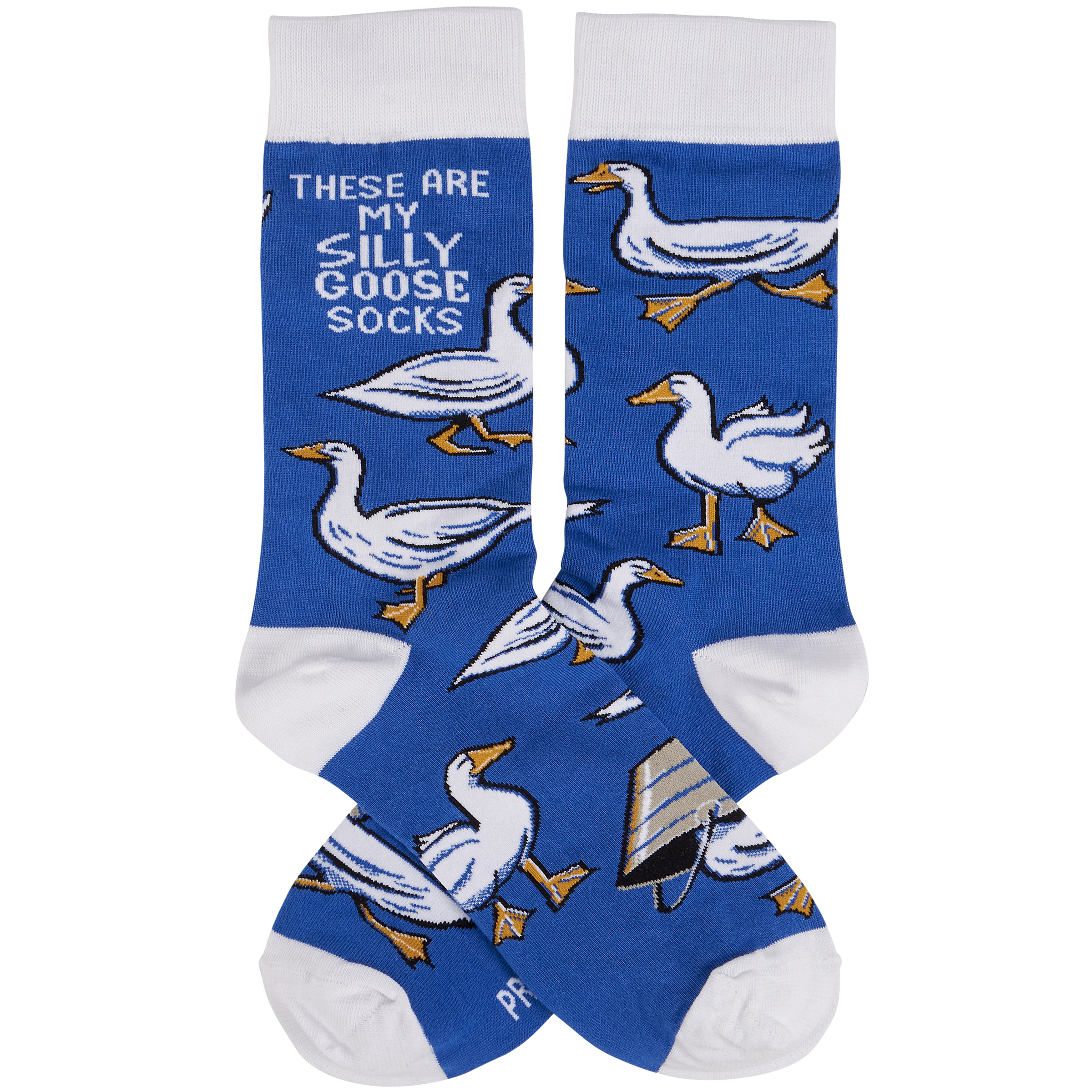 A pair of colorful socks from our LOL-Made You Smile Collection displaying playful hand illustrated designs of walking geese and a goose wearing a bucket on its head with a humorous sentiment that reads "These Are My Silly Goose Socks." These giftable socks are made with a cotton, nylon, and spandex blend for a one size fits most design. Our Silly Goose Socks come with a decorative header card and a clear plastic hanger for easy rack display and gifting. A funny gift perfect for everyday self-expression.