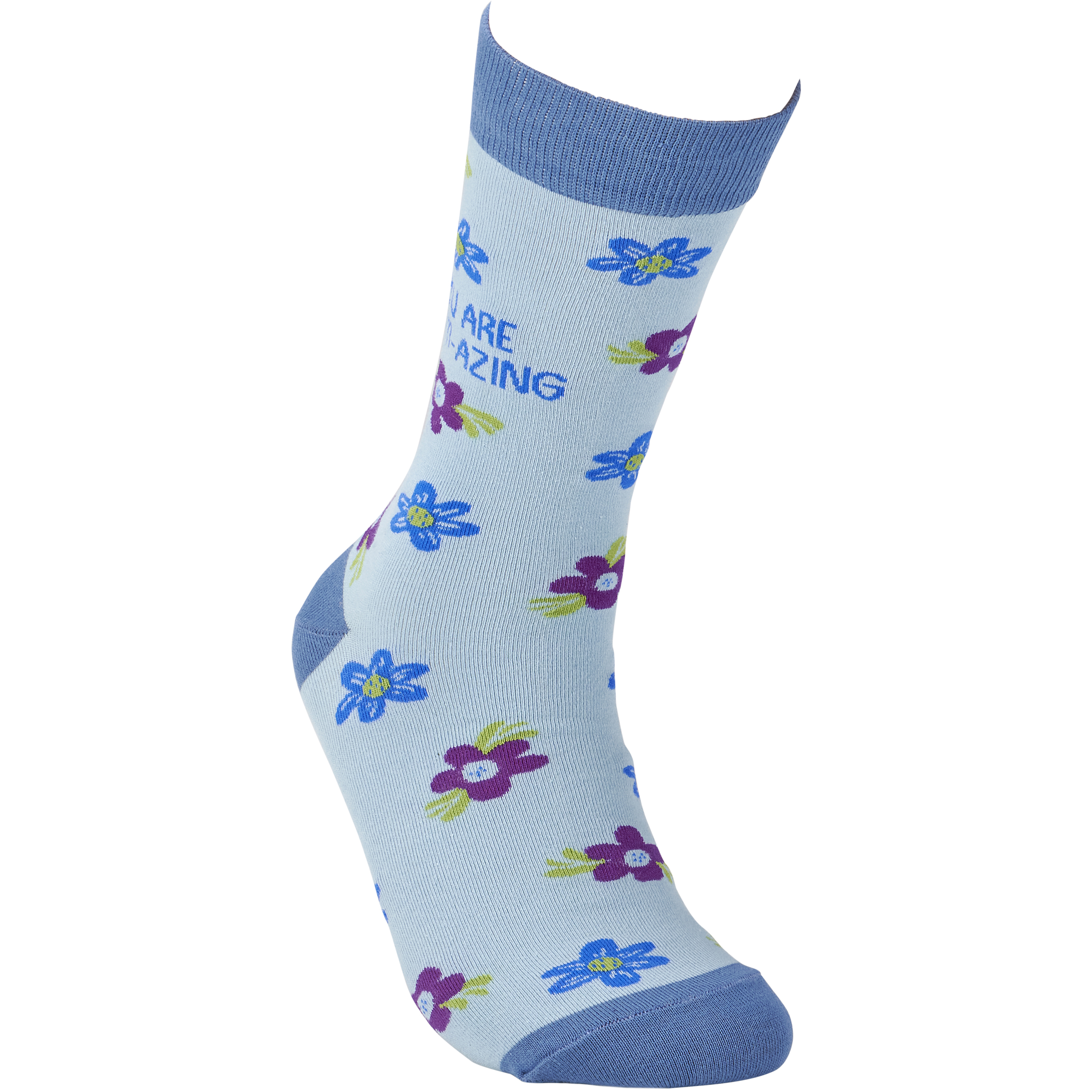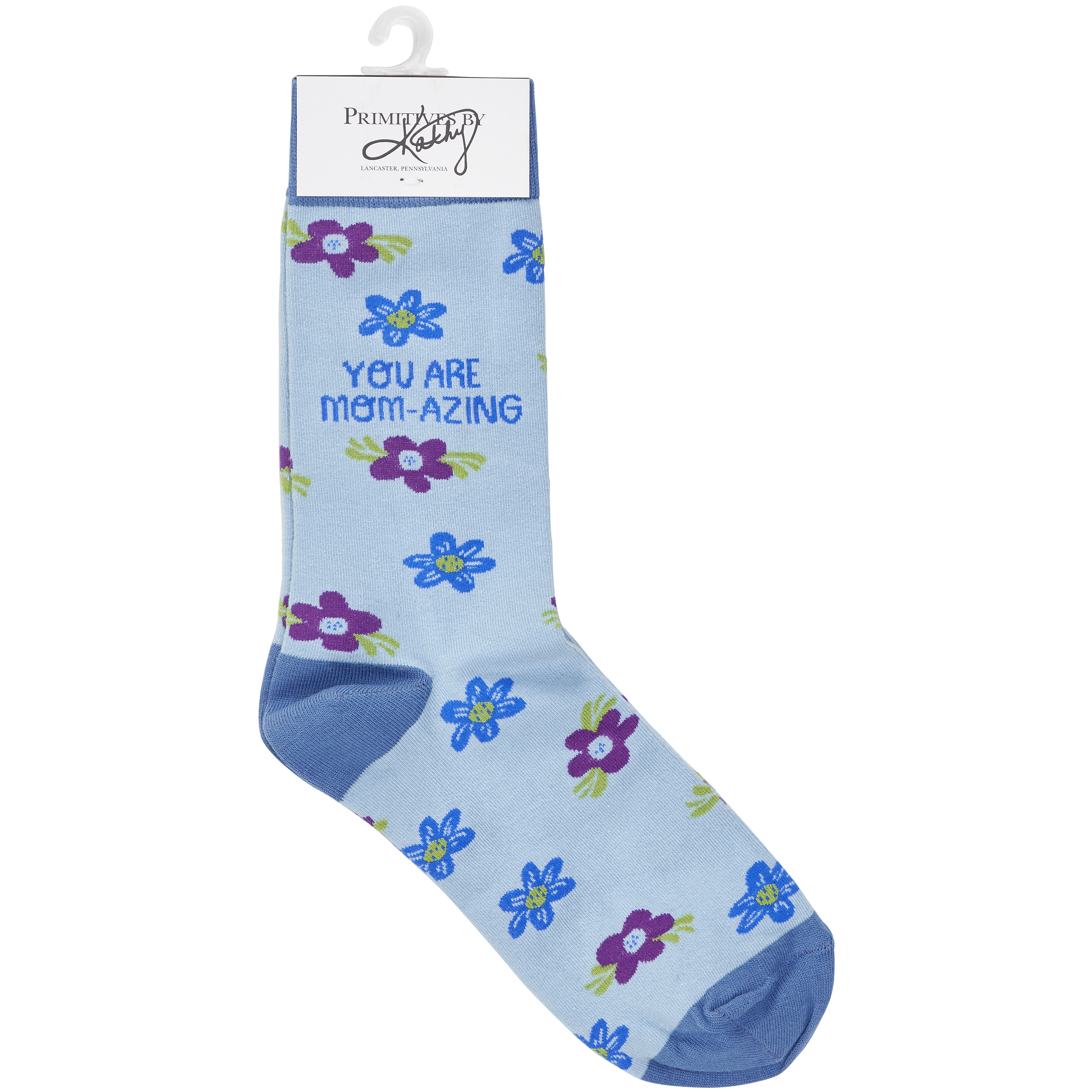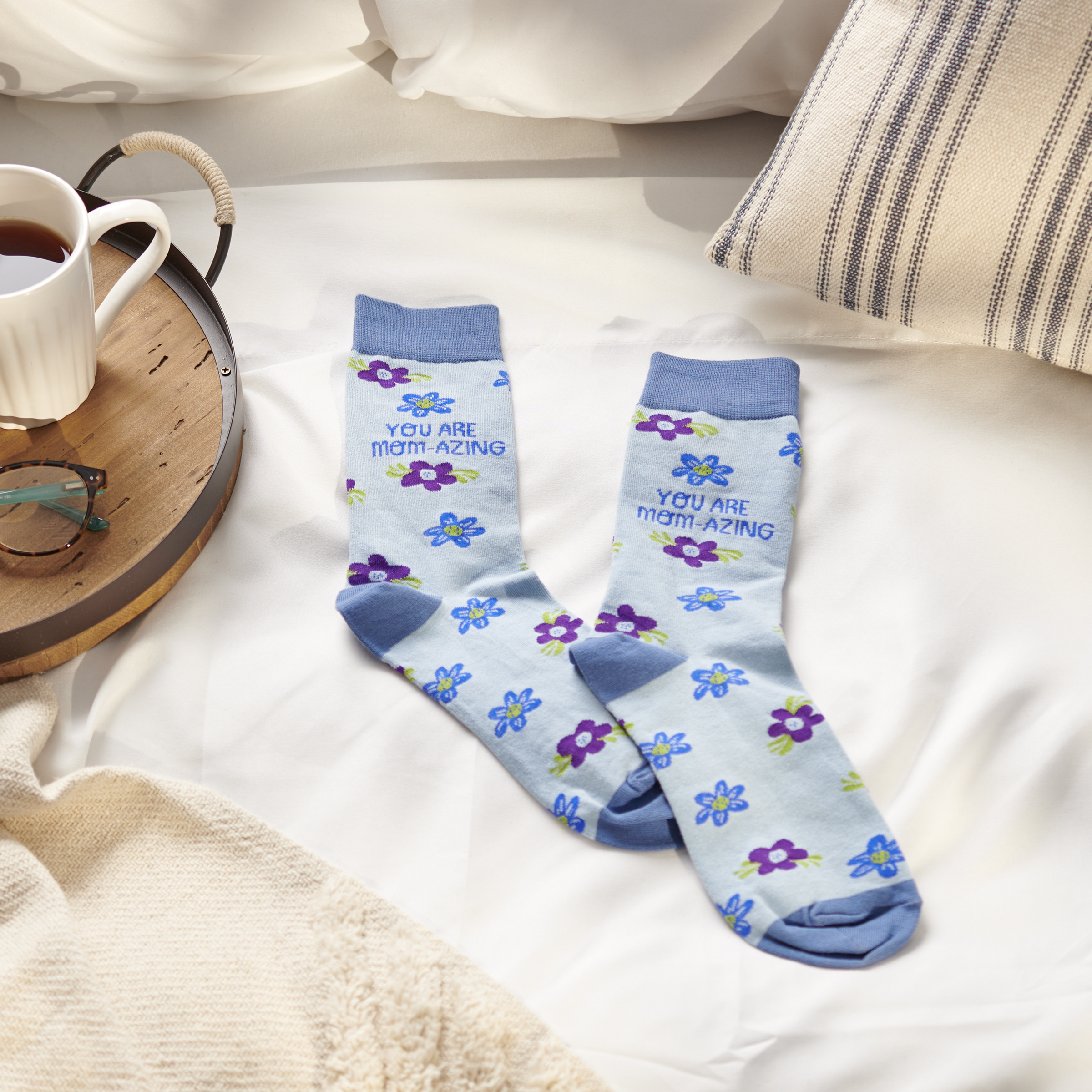 A pair of colorful woven socks from our Mother's Day Collection displaying unique hand illustrated designs of flowers with a fun mom-themed sentiment that reads "You Are Mom-azing." Socks feature a one size fits most design made with cotton, nylon, and spandex. Our Mom-azing socks come with a header card and a clear plastic hanger for display. A fun Mother's Day gift and accessory perfect for everyday self-expression.