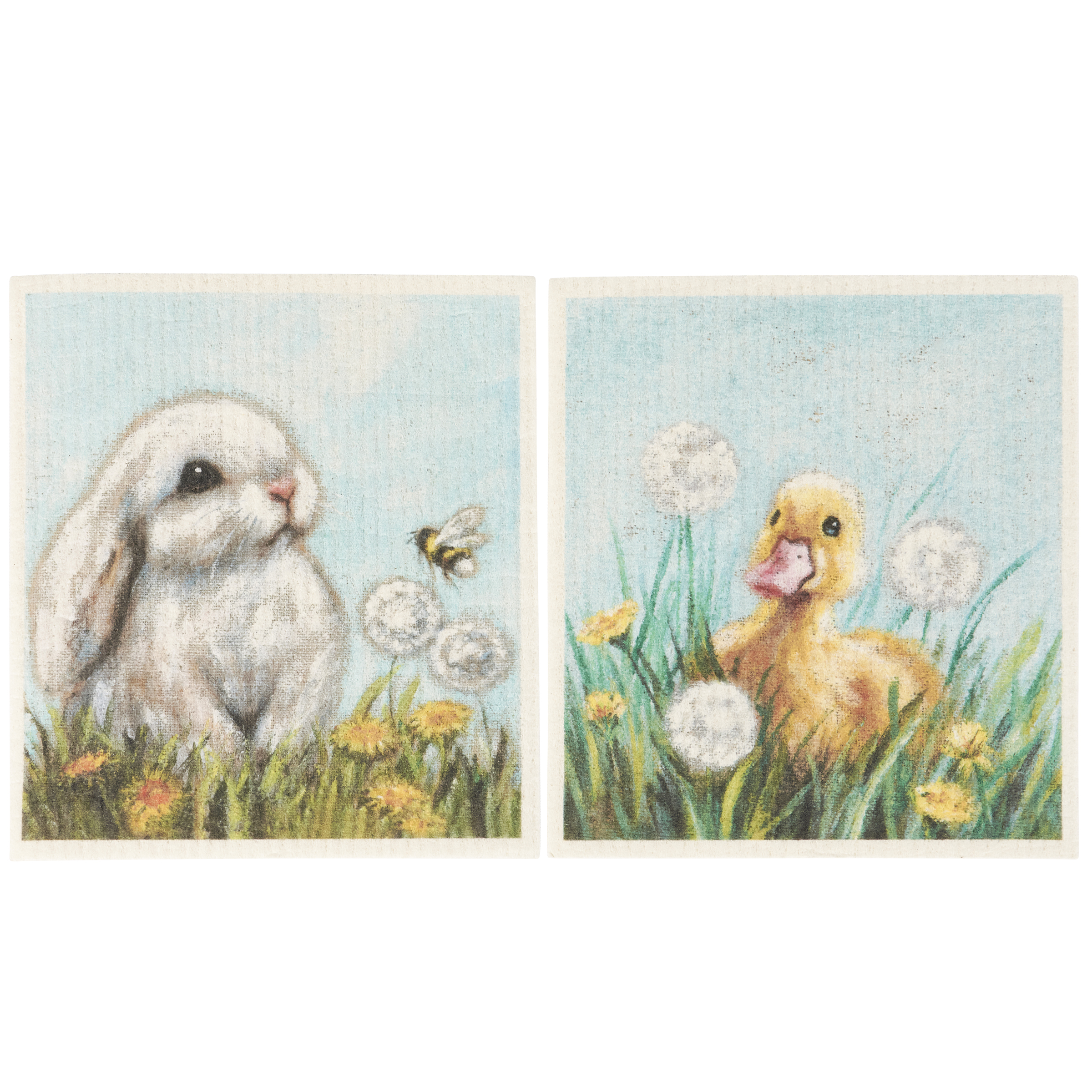 Safe to use on all types of surfaces, eco-friendly Swedish Dishcloths dry quickly and are antibacterial for more hygienic cleaning with reduced waste. This set of 2 Swedish Dishcloths from our Easter & Spring Collection features charming scenes of a white bunny and duckling with spring flowers. Designs are replicated from original artwork painted onto burlap canvas, giving the art a unique depth and texture. Our White Bunny Swedish Dishcloth set is machine-washable for convenient cleaning. Dishcloths are attached to header card with hole for easy rack display. A spring-themed set of reusable dishcloths perfect for replacing dull sponges and paper towels with long-lasting colorful designs.