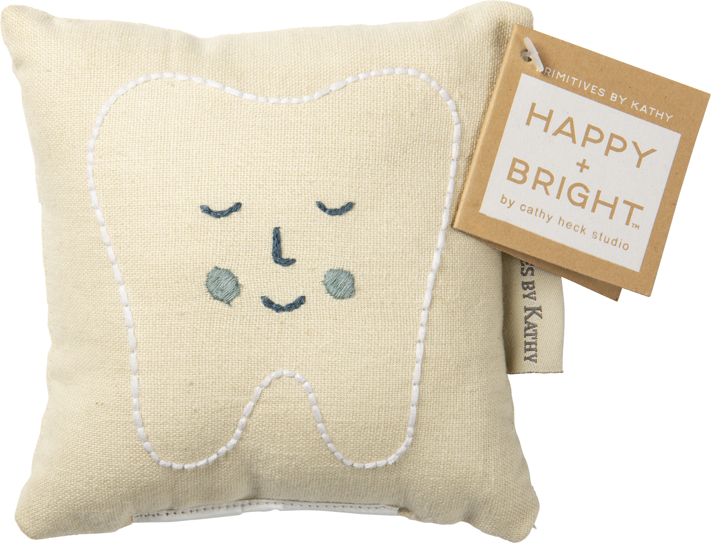 A double-sided cotton linen blend pillow from our Baby & Kids Collection featuring embroidered tooth design on front, and "Dear Tooth Fairy Please Stop Here" sentiment in blue on back pocket. Pocket is perfect for storing a tooth for the tooth fairy! Polyester filled. Tooth Fairy pillow complements well with other pieces in collection to create a cohesive display. A part of our exclusive Happy + Bright Collection. Textiles are phthalate and AZO dye free. Our Blue Tooth Fairy Pillow is shipped vacuum-sealed for protection and storage.