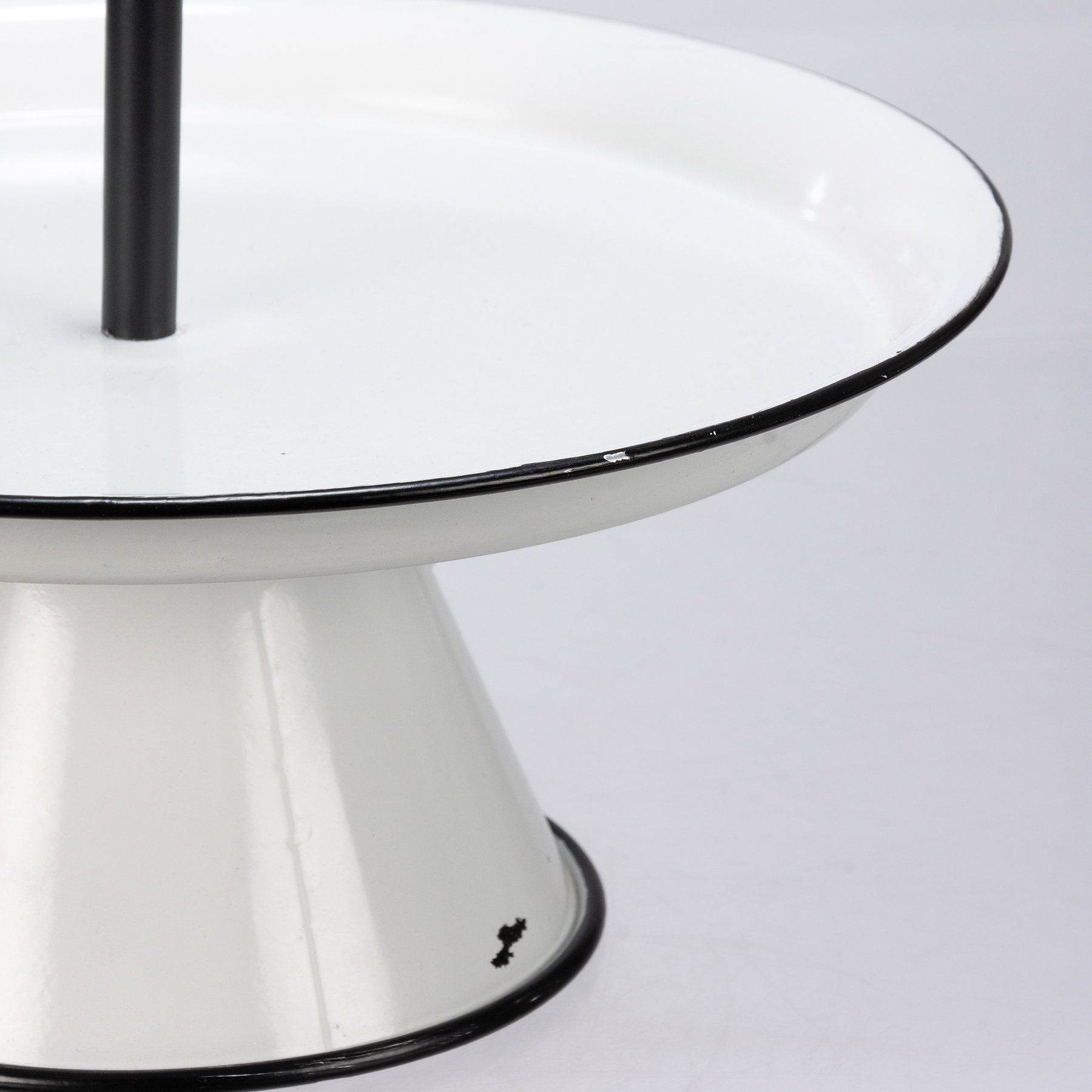 A single tier pedestal tray from our Farmhouse Collection perfect for displaying small items. This metal tray features an enamel-like finish and distressed details for added appeal. Assembly required for the single tiered pedestal tray.