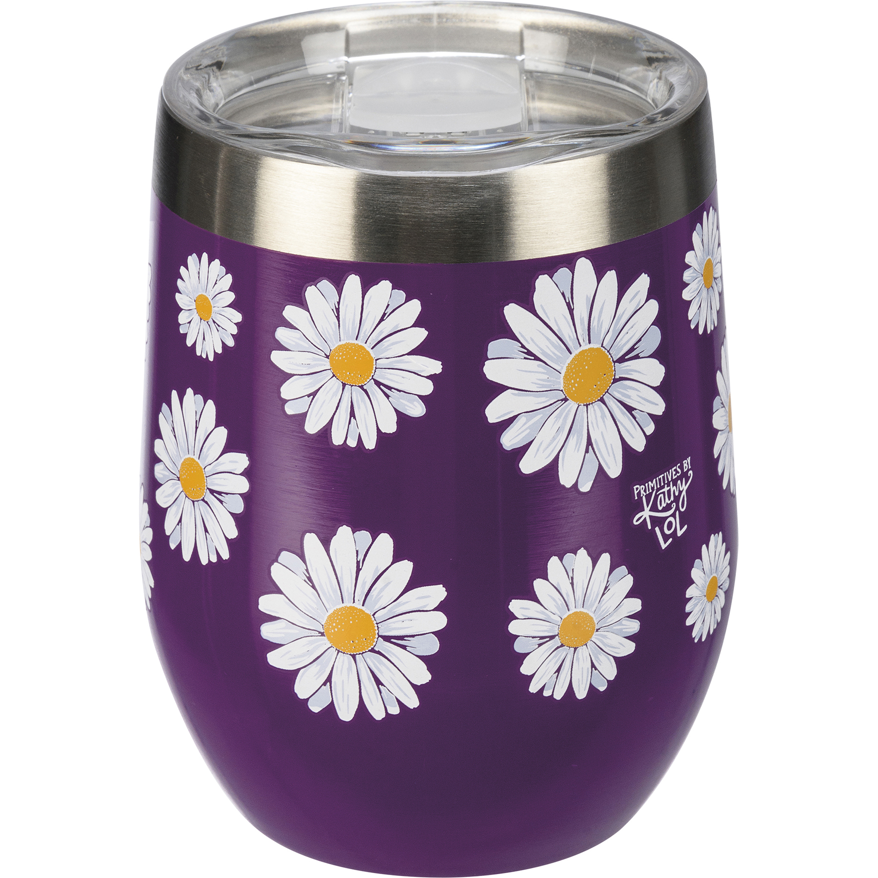 A stainless steel wine tumbler featuring "Mama Needs Some Wine" sentiment with colorful full wrap-around daisy designs. Holds 12 oz. Includes plastic lid and is insulated to keep beverages cold for 8 hours and hot for 4 hours. Hand-wash recommended. Packaged in a kraft paper box.
