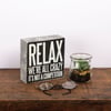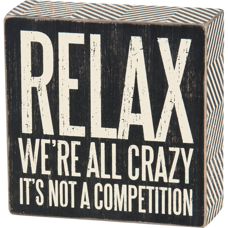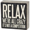 A classic black and white wooden box sign featuring a distressed "Relax - We're All Crazy It's Not A Competition" sentiment with zigzag trim designs. Easy to hang or can free-stand alone.