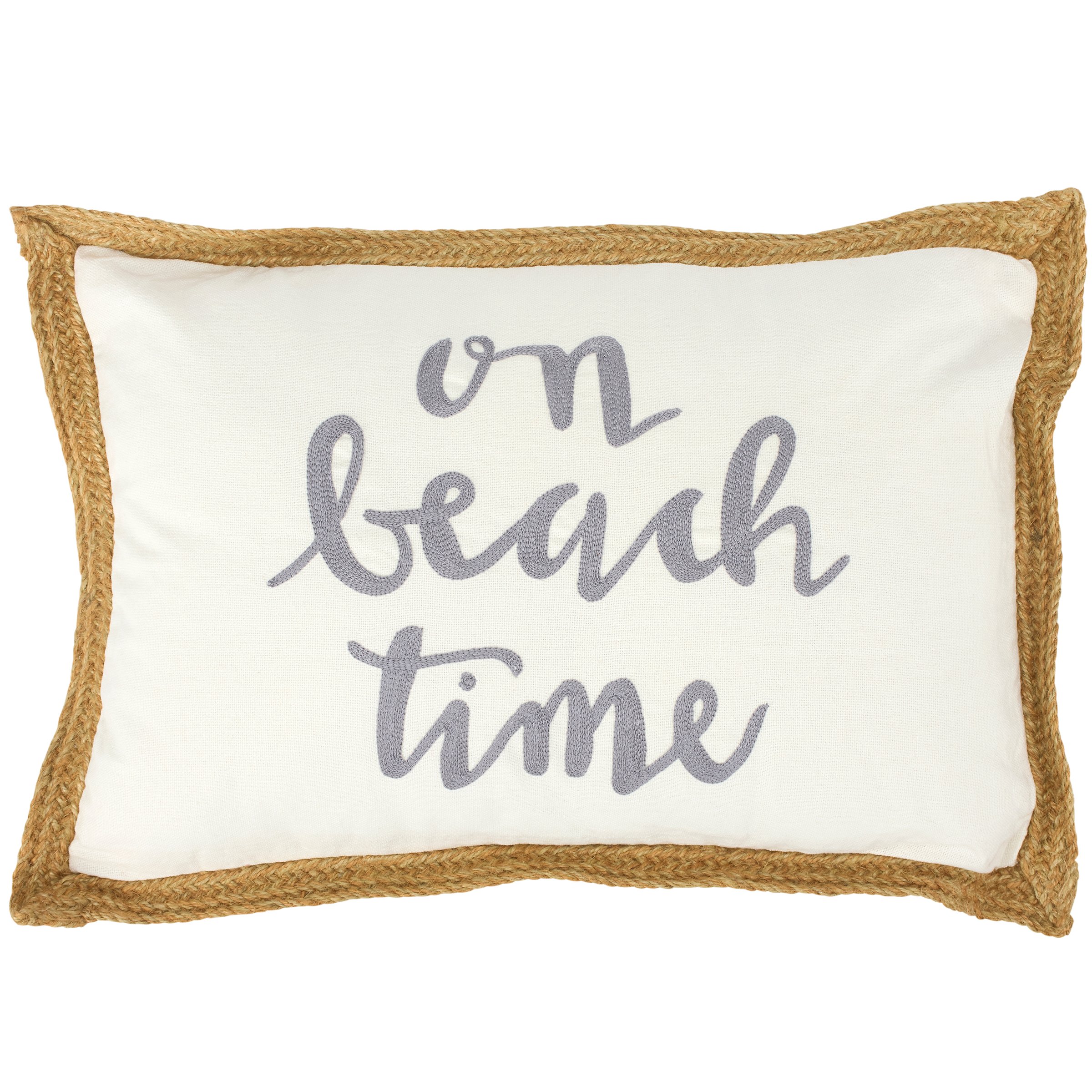 A pillow from our Beach Collection lending a hand-guided flat chain stitched "On Beach Time" hand lettered sentiment and braided jute rope trim. This On Beach Time pillow complements well with coordinating design pieces for a great gift set or decor collection. Shipped vacuum sealed for protection and storage.