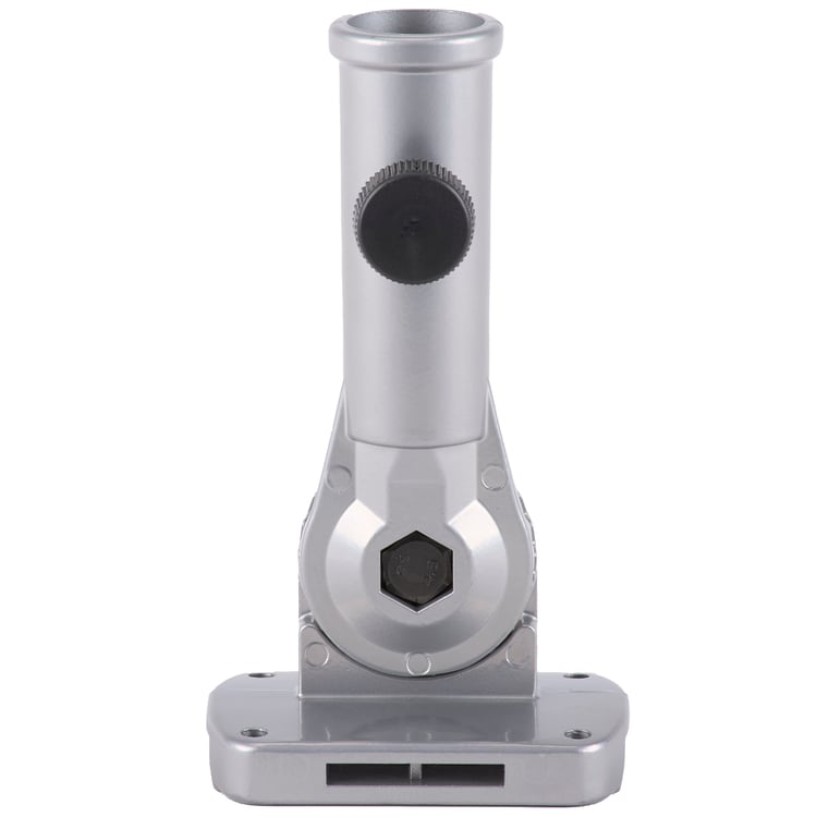 A metal flag pole bracket displaying a subtle matte silver design that easily coordinates with both seasonal and everyday house flags from our Primitives by Kathy House Flag Collection. This adjustable flag pole bracket features sturdy serrated locking plates with an easy to use wing nut tightener offering over 10 positioning options and a tightening knob to secure a flag pole in the mount. The flag pole mount fits flag poles up to 1 inch thick and 5 feet in length and also features a drainage hole to avoid filling with water when used outdoors. Our adjustable flag pole bracket offers multiple mounting options including hardware to attach to flat surface using the predrilled holes as well as slots on the sides for wrapping to a pillar or other cylindrical surfaces. Pair any of our ready-to-display house flags and our house flag pole with this easy to-use home décor accessory perfect for year-round outdoor displays.