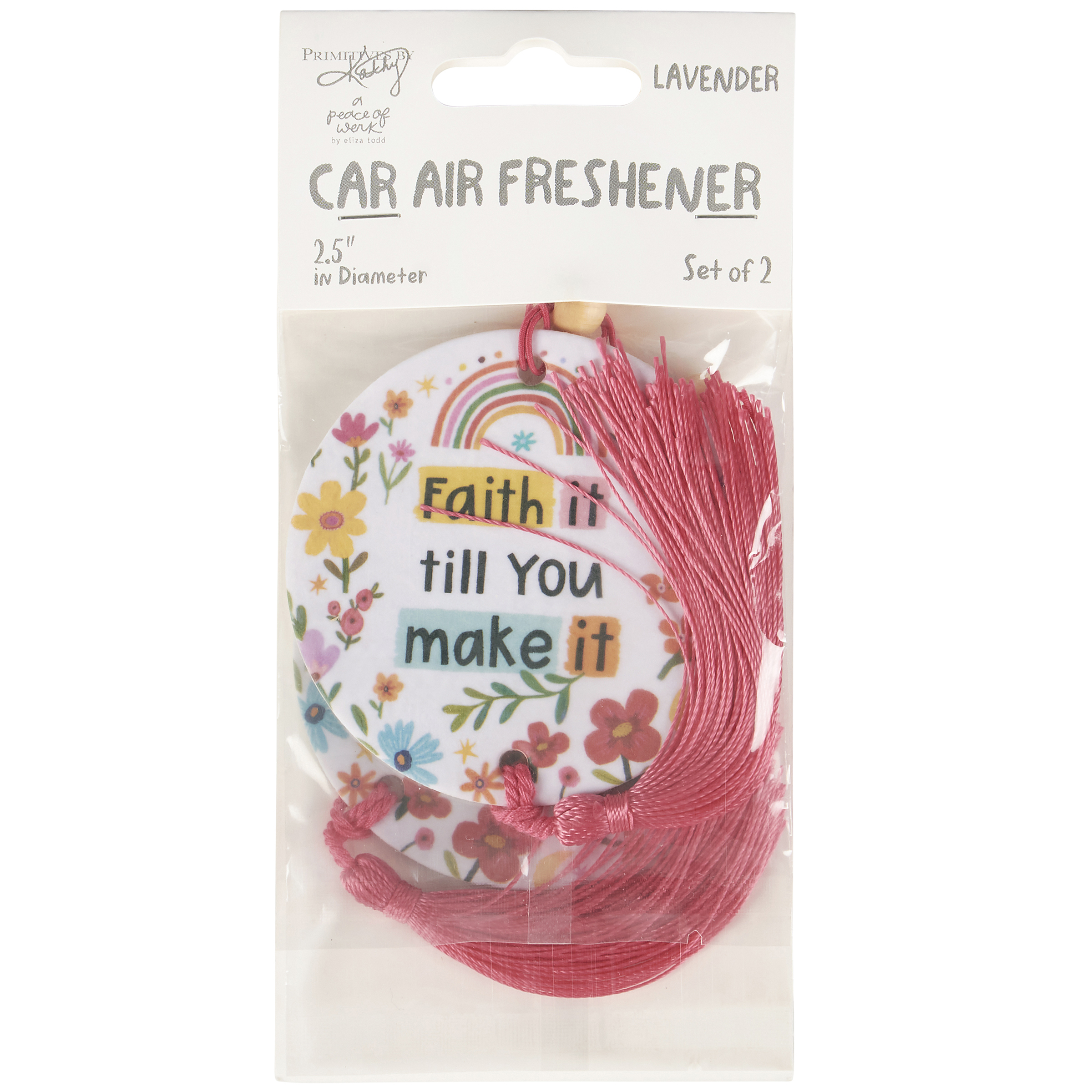 A set of two double-sided air fresheners from our Inspiration & Blooms Collection displaying vibrant rainbow and flower designs surrounding a motivational sentiment that reads "Faith It Till You Make It." Each air freshener features decorative accents including a coordinating pink hanging tassel and wooden bead on string hanger. Our Faith It air fresheners are perfect to hang in car, office, or any space to release a calming lavender aroma. Air freshener scent lasts approximately 2 years while sealed and 30 days after opened. Car air freshener set is packaged in a poly bag and attached to a header card for easy rack display. An inspirational everyday accessory perfect for gifting.