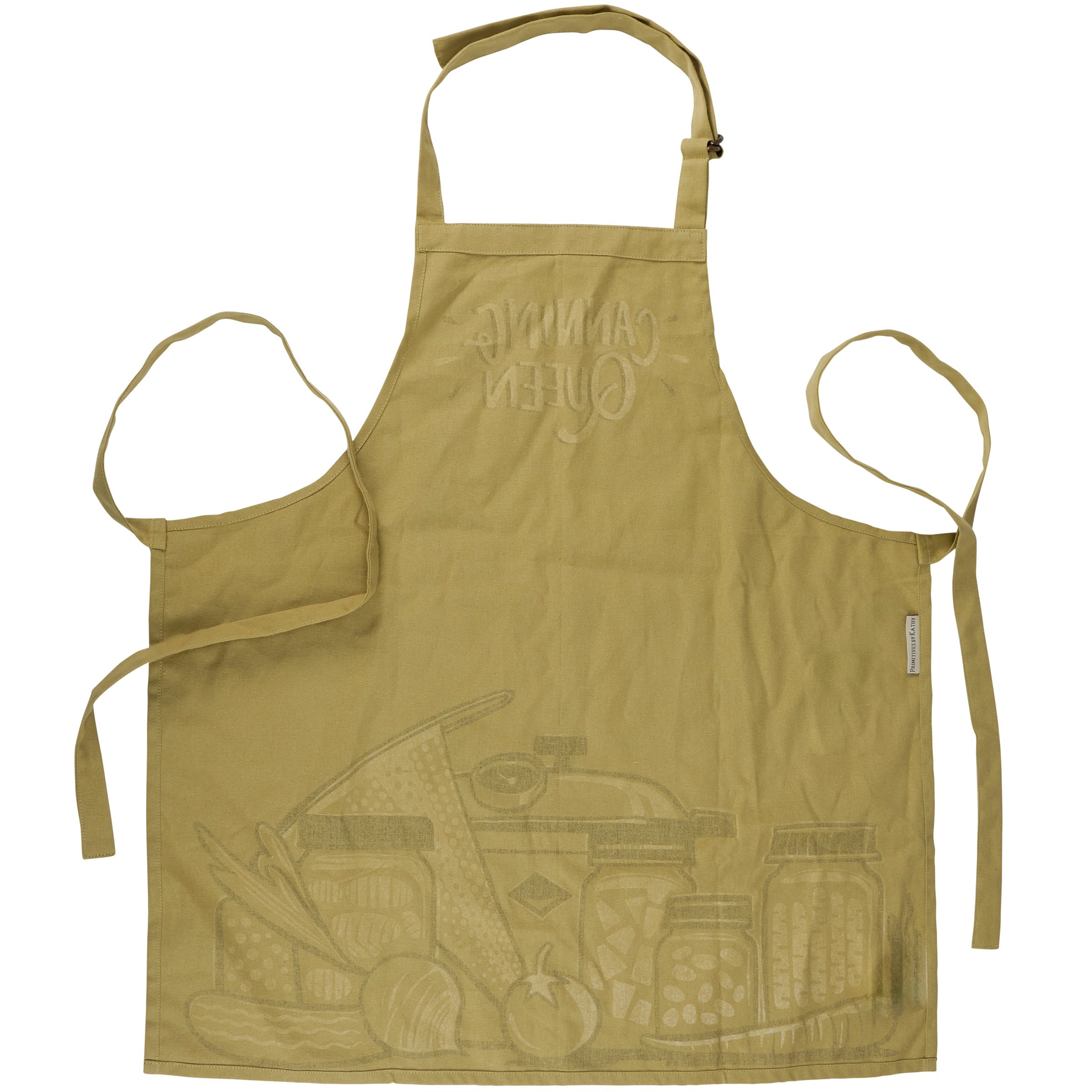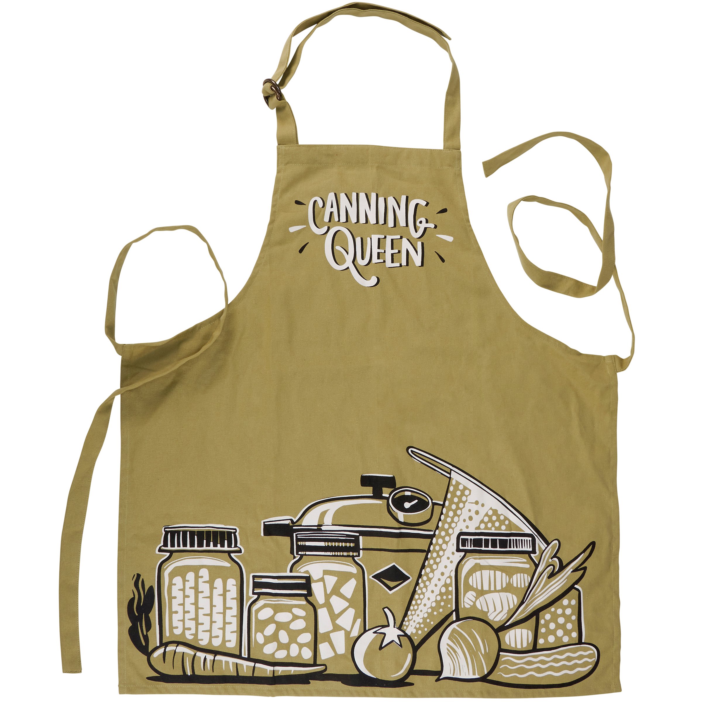An olive green cotton apron from our Homestead Collection displaying a hand illustrated design of canning jars and a variety of vegetables with a fun canning-themed sentiment that reads "Canning Queen." Kitchen apron includes adjustable neck strap and waist ties to create the perfect fit. Our Canning Queen apron is machine-washable for convenient cleaning. A fun food canning themed gift perfect for homesteaders.