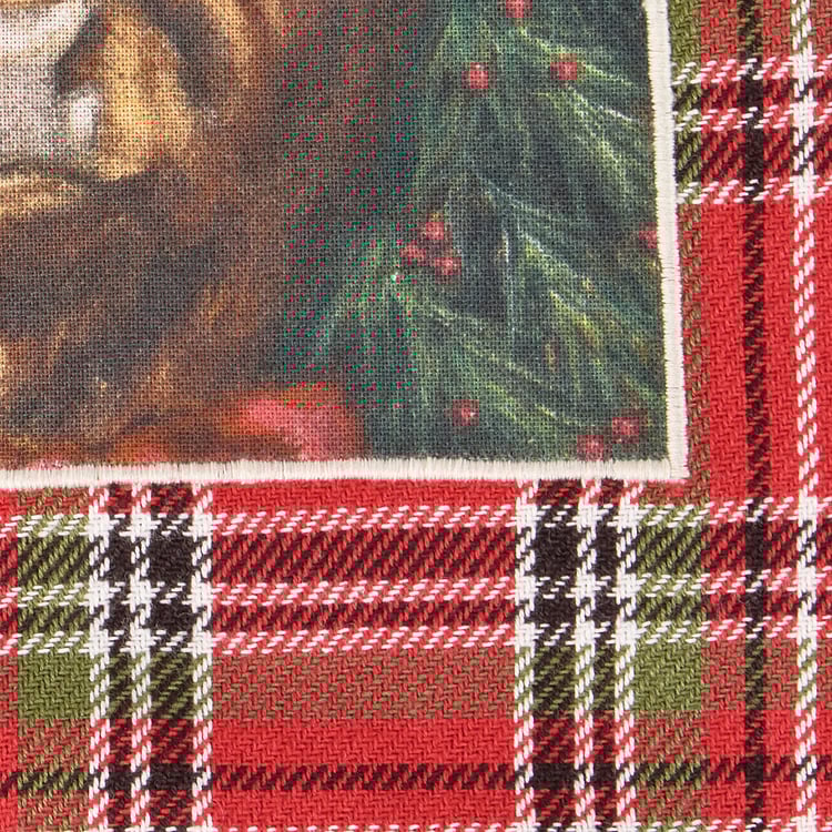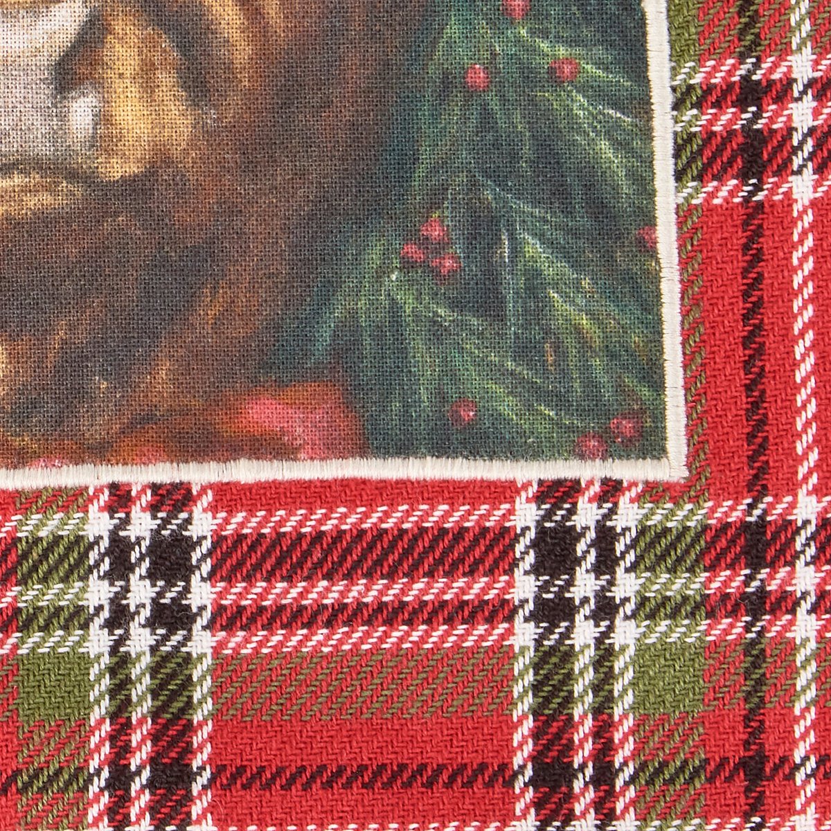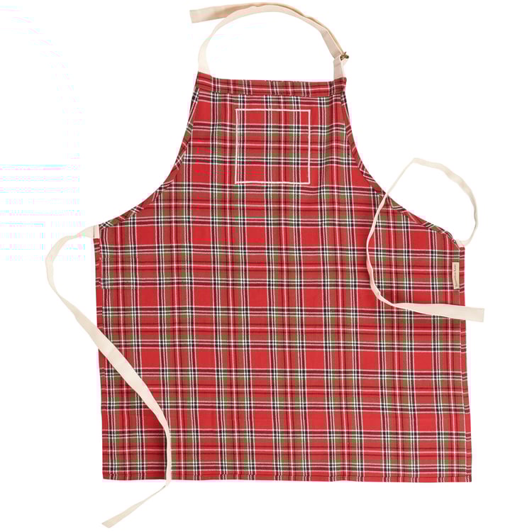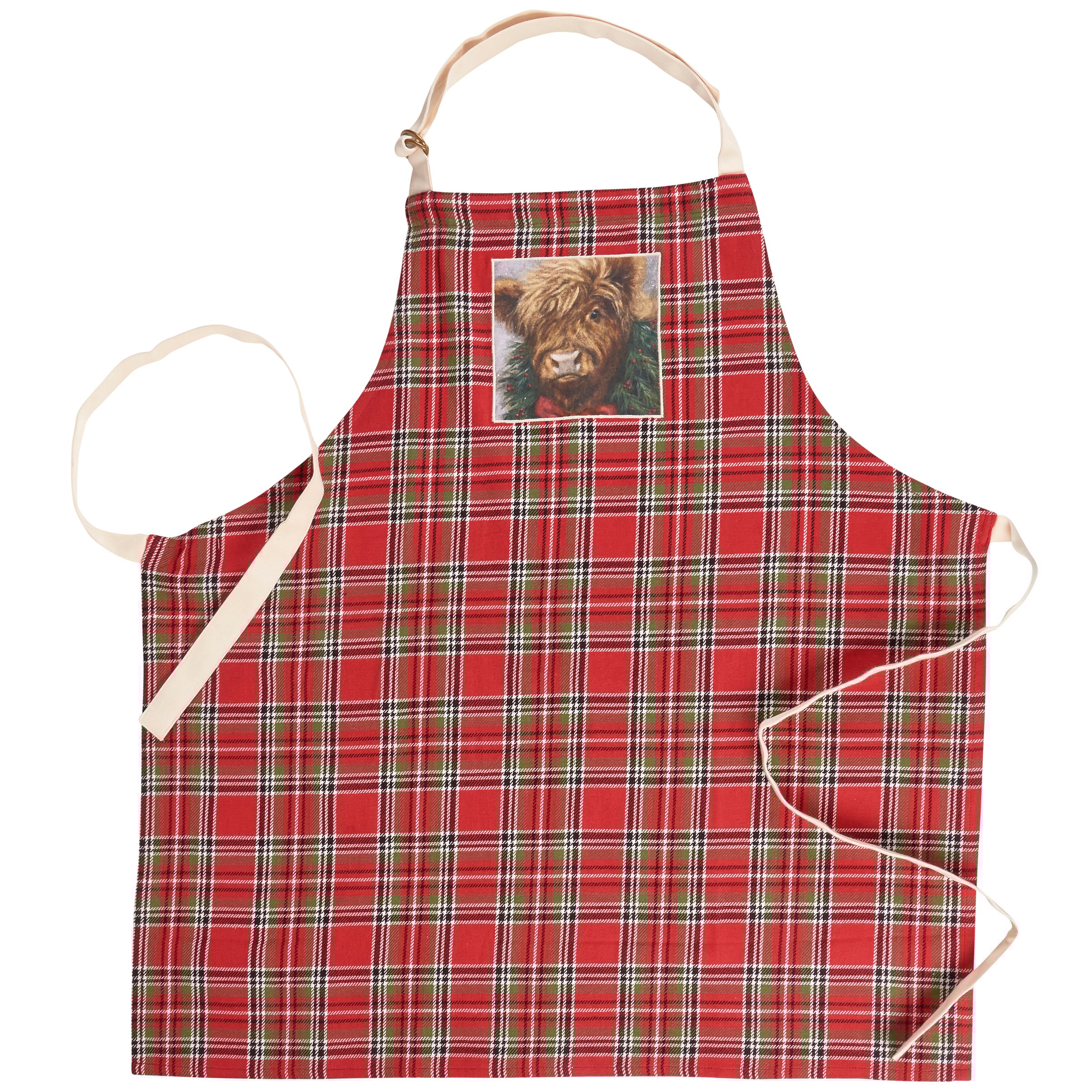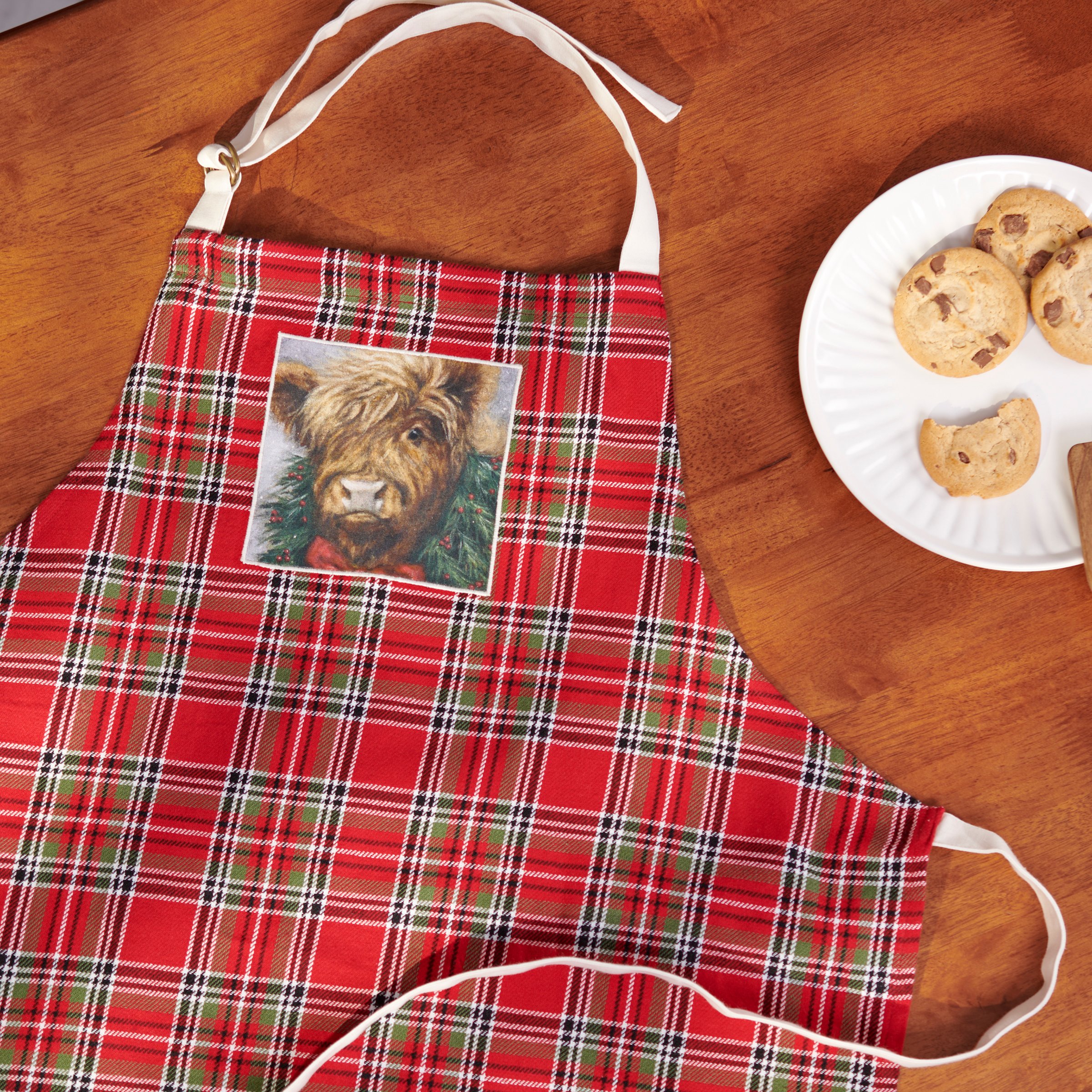 A holiday apron from our Christmas Collection featuring a Christmas tartan plaid design with a stitched art panel on the top. Art panel displays a highland cow wearing a holiday wreath replicated from original artwork painted onto burlap canvas, giving the art a unique depth and texture. Holiday apron includes adjustable neck strap and waist ties to create the perfect fit. Our Christmas Highland apron is conveniently machine-washable for easy cleaning. A rustic seasonal kitchen accessory that is great for gifting.