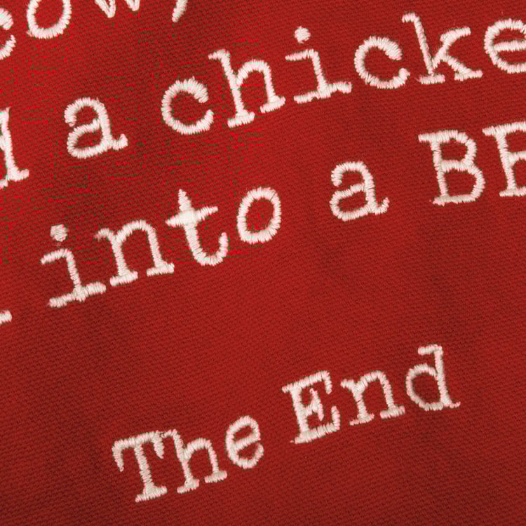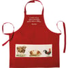A cotton apron from our Farmhouse Collection featuring an embroidered "A Cow, A Pig And A Chicken Walk Into A BBQ . . . The End" sentiment and three front pockets featuring vintage-style farm animal designs. Includes adjustable neck and waist straps. Our Walk Into A BBQ apron is machine-washable.