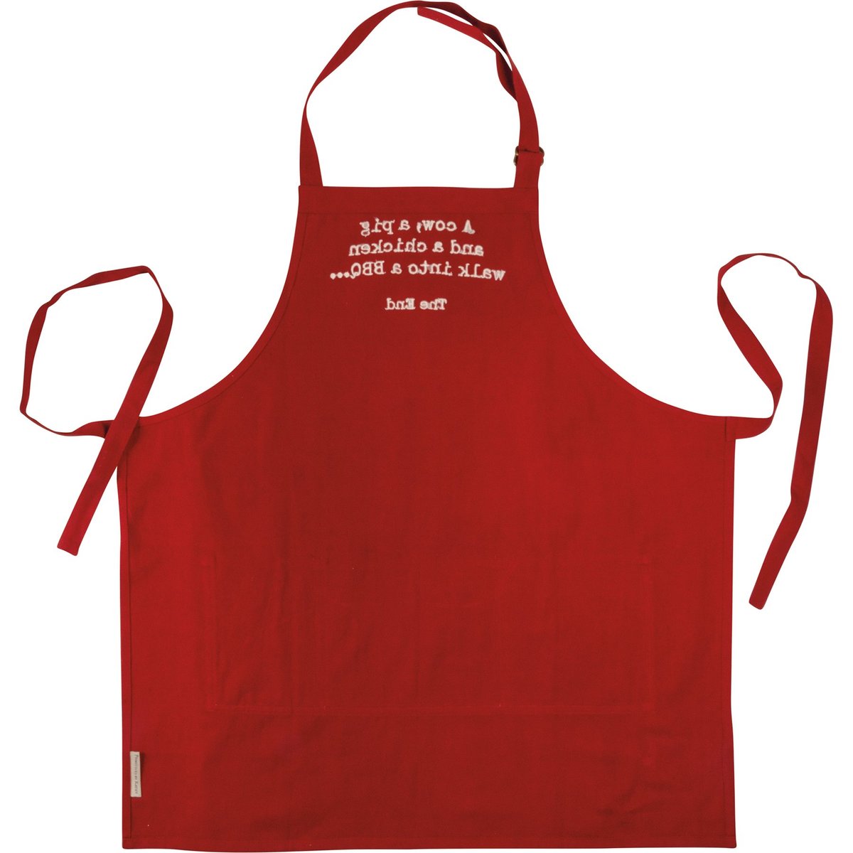 A cotton apron from our Farmhouse Collection featuring an embroidered "A Cow, A Pig And A Chicken Walk Into A BBQ . . . The End" sentiment and three front pockets featuring vintage-style farm animal designs. Includes adjustable neck and waist straps. Our Walk Into A BBQ apron is machine-washable.