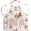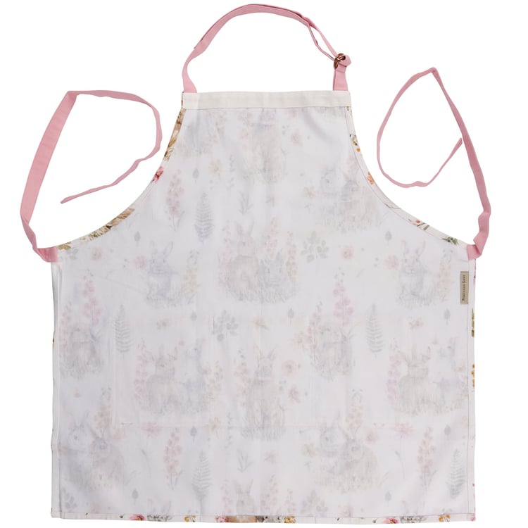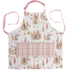 A seasonal apron from our Easter & Spring Collection displaying a pattern of bunnies and spring flowers with a coordinating spring inspired plaid on the three pocket section. Design is replicated from original hand painted art in a delicate watercolor style. Seasonal apron includes pink adjustable neck strap and waist ties to create the perfect fit. Our Flower Bunny apron is conveniently machine-washable for easy cleaning. Accessories pictured not included. A spring-themed kitchen accessory perfect for seasonal use.