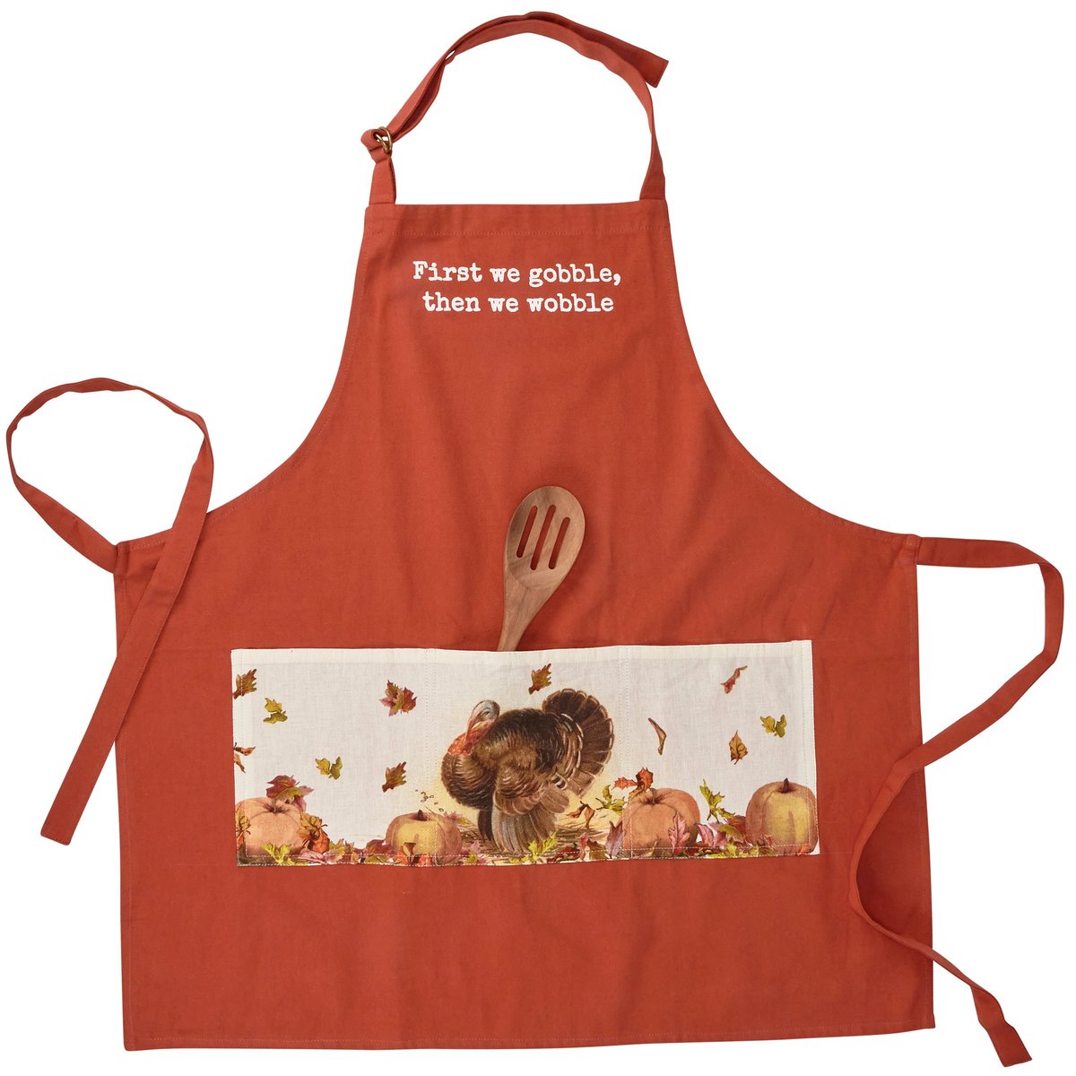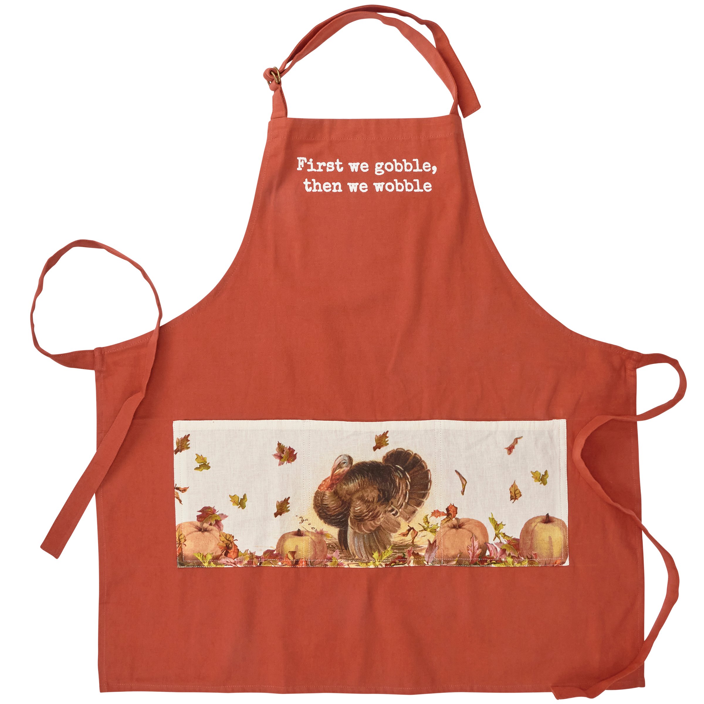 A holiday apron from our Fall & Harvest Collection displaying vintage art of a turkey with pumpkins and falling autumn leaves on the three pocket section. Design also features a coordinating fall pun embroidered at the top that reads "First We Gobble, Then We Wobble." Seasonal apron includes adjustable neck strap and waist ties to create the perfect fit. Our Gobble Then We Wobble apron is conveniently machine-washable for easy cleaning. Accessories pictured not included. A fun fall-themed kitchen accessory perfect for seasonal use.