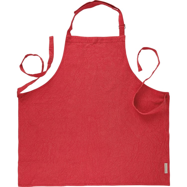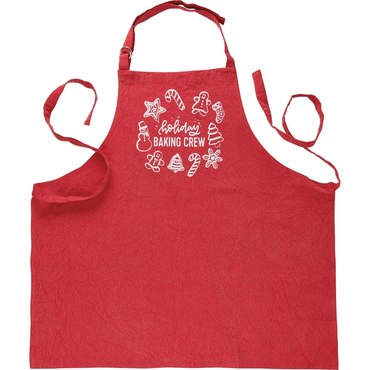 A red apron from our Christmas Collection displaying white hand illustrated designs of holiday cookie surrounding a fun "Holiday Baking Crew" sentiment in a chalk art style on stonewashed cotton. Apron includes adjustable neck strap and waist ties to create the perfect fit. Our Holiday Baking Crew apron is machine-washable for convenient cleaning. A jolly seasonal kitchen accessory great for gifting.