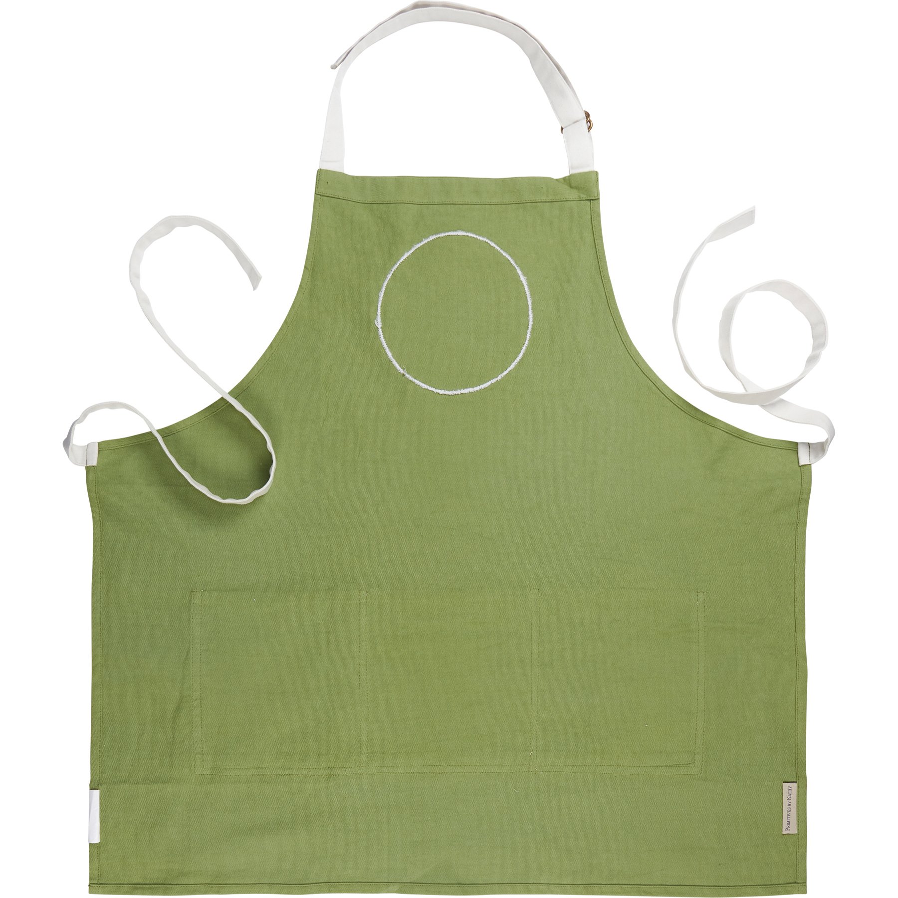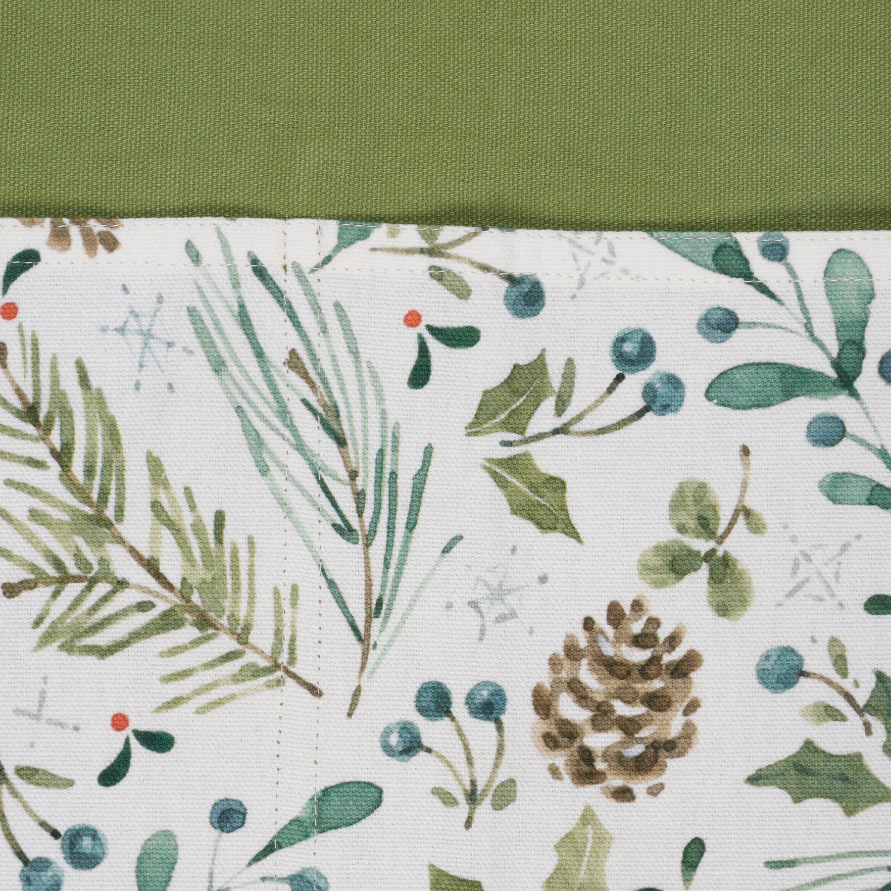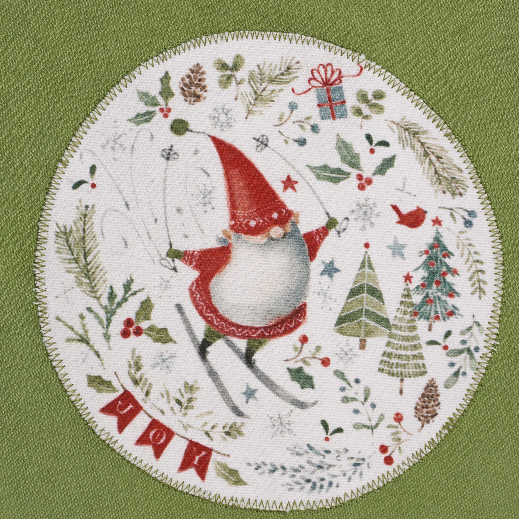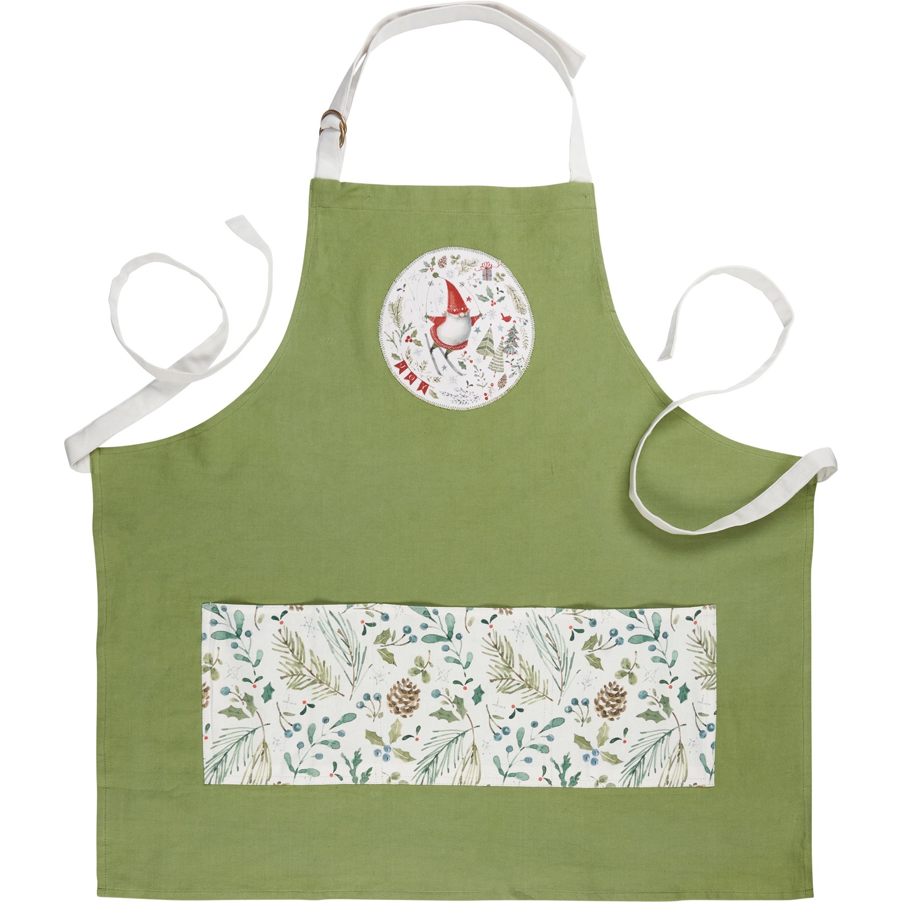 A green cotton apron from our Christmas Collection displaying hand painted holiday greenery across the three white front pockets with a stitched art panel on top. Design on stitched panel displays a jolly Christmas Gnome skiing surrounded by greenery with "Joy" sentiment. Apron includes adjustable neck strap and waist ties in a white color to create the perfect fit. Our Joy Christmas Gnome apron is machine-washable for convenient cleaning. Accessories pictured not included. A joyful seasonal kitchen accessory great for gifting.