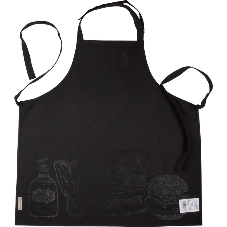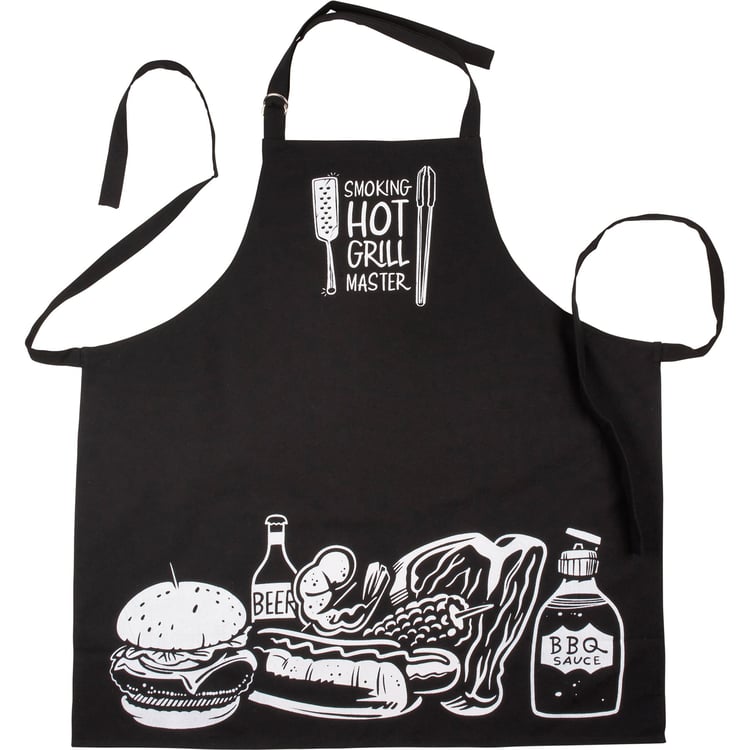 A black cotton apron from our Grilling & Chilling Collection displaying white hand illustrated food designs and "Smoking Hot Grill Master" sentiment. Apron includes adjustable neck strap and waist ties to create the perfect fit. A fun gift that will bring laughter to the lawn during the next cookout. Our Smoking Hot Grill Master apron is machine-washable for convenient cleaning.