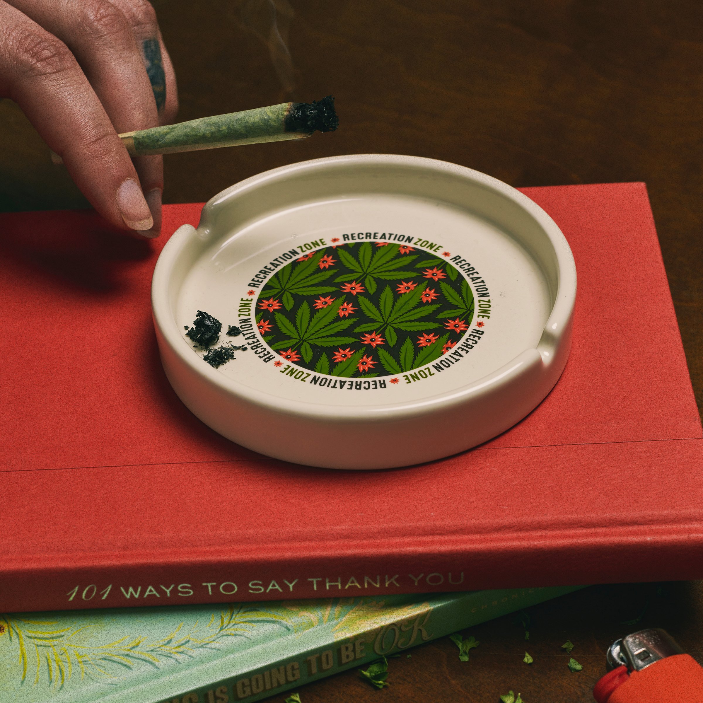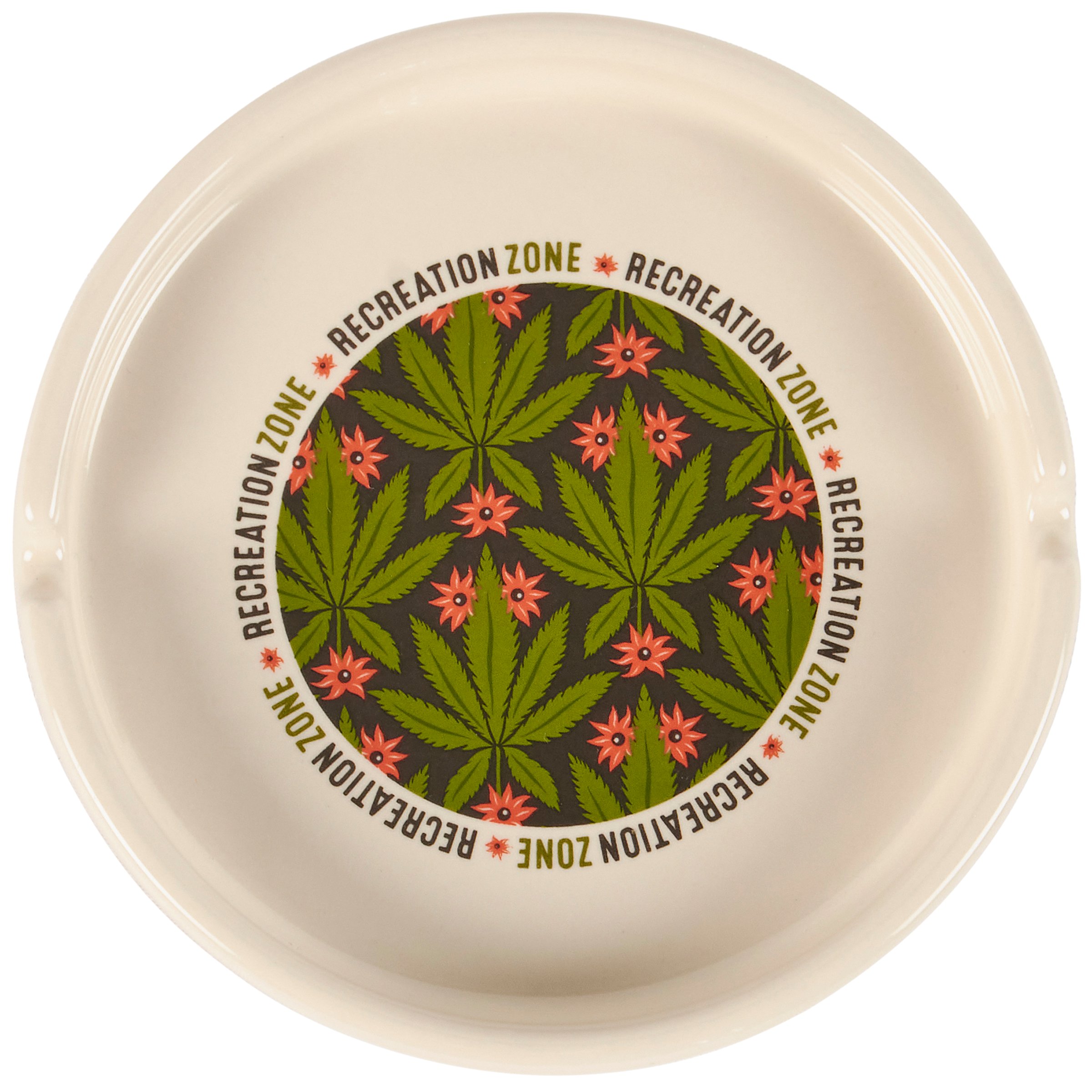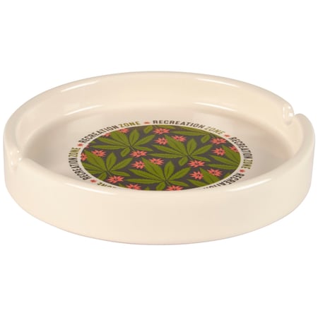 Give anyone that steps into personal space a vibe check with this down-to-earth ashtray. Our durable stoneware ashtray displays a relaxing pot leaf pattern accented with "Recreation Zone" all in an earthy color palette. Questionables everyday ashtray features two grooves to easily share during a friendly chillsesh. Accessories pictured not included. Our Recreation Zone ashtray is designed to maximize chill at home or for gifting to pass that feeling to someone who needs it.