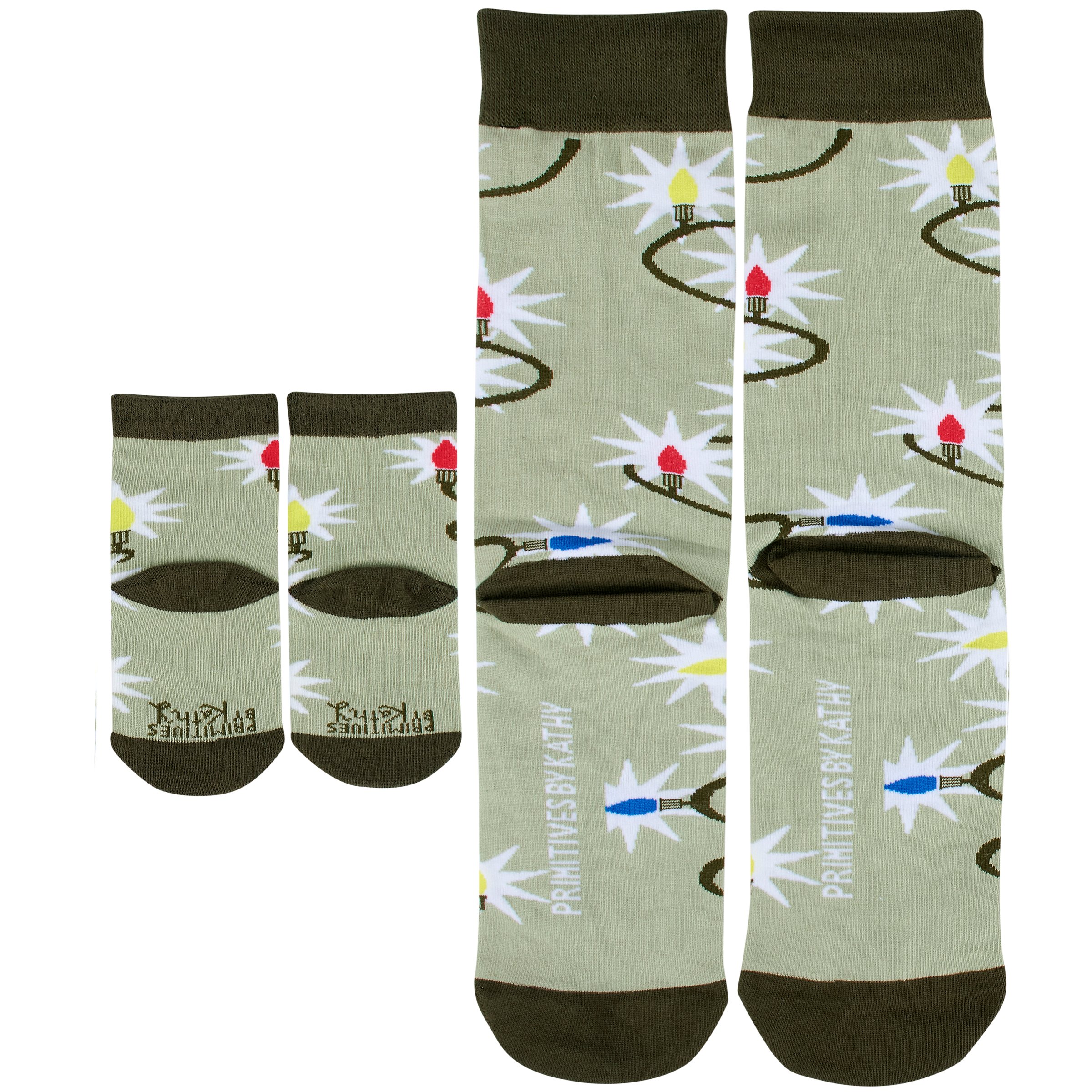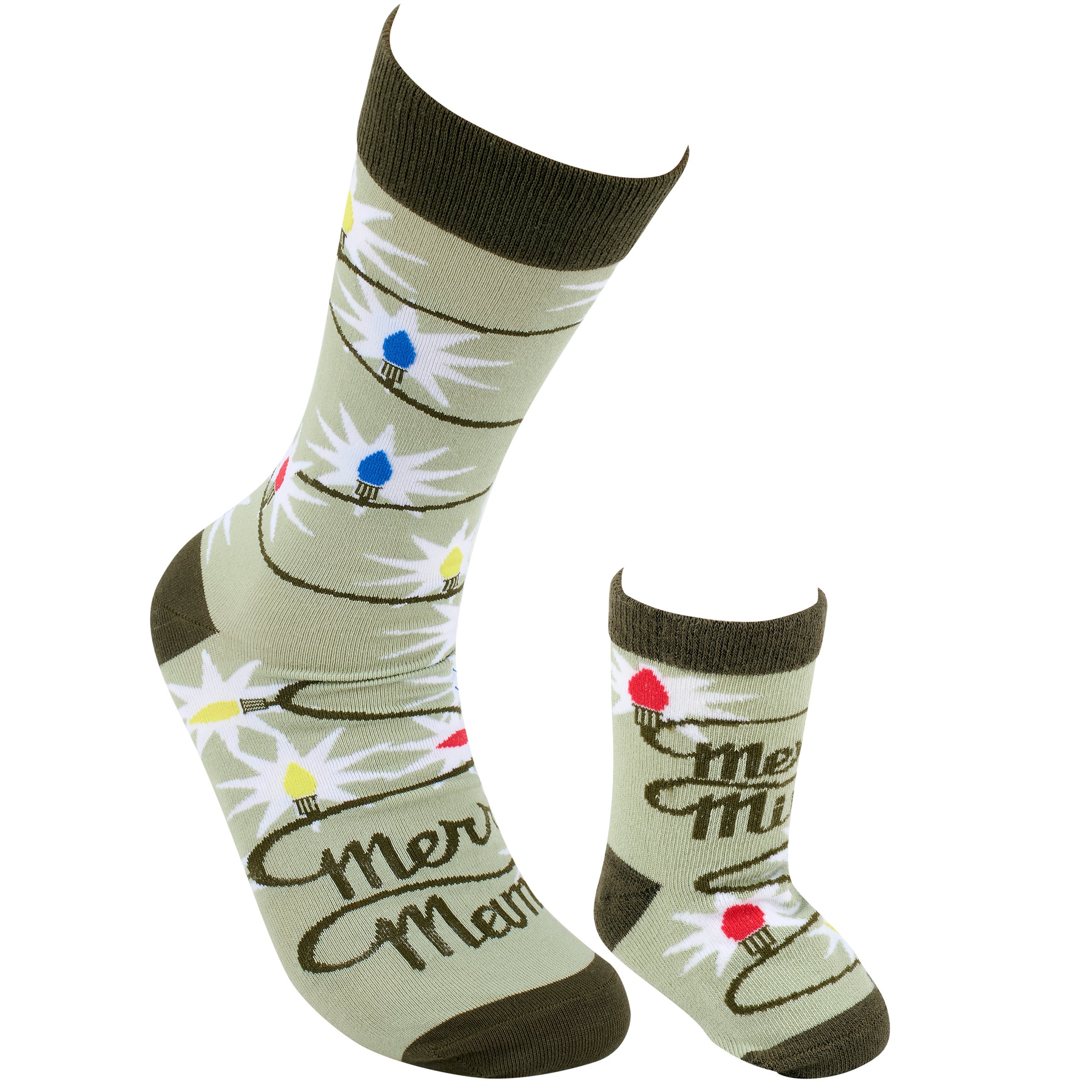 A cute baby & me gift set from our Christmas Collection featuring colorful pairs of matching socks that include one adult pair and one baby pair to create fun seasonal moments. Each pair displays playful hand illustrated Christmas tree light designs with fun seasonal sentiments that read "Merry Mama" on the adult socks and "Merry Mini" on the baby socks. This seasonal sock set is made with a cotton, nylon, and spandex blend for a one size fits most design for the adult pair and baby socks that fit 0-12 months. Our Merry Mama baby & me sock set comes packaged together with a decorative header card making it great for gifting as well as a clear plastic hanger for easy rack display. A fun baby & me matching sock set perfect for a family Christmas gift.