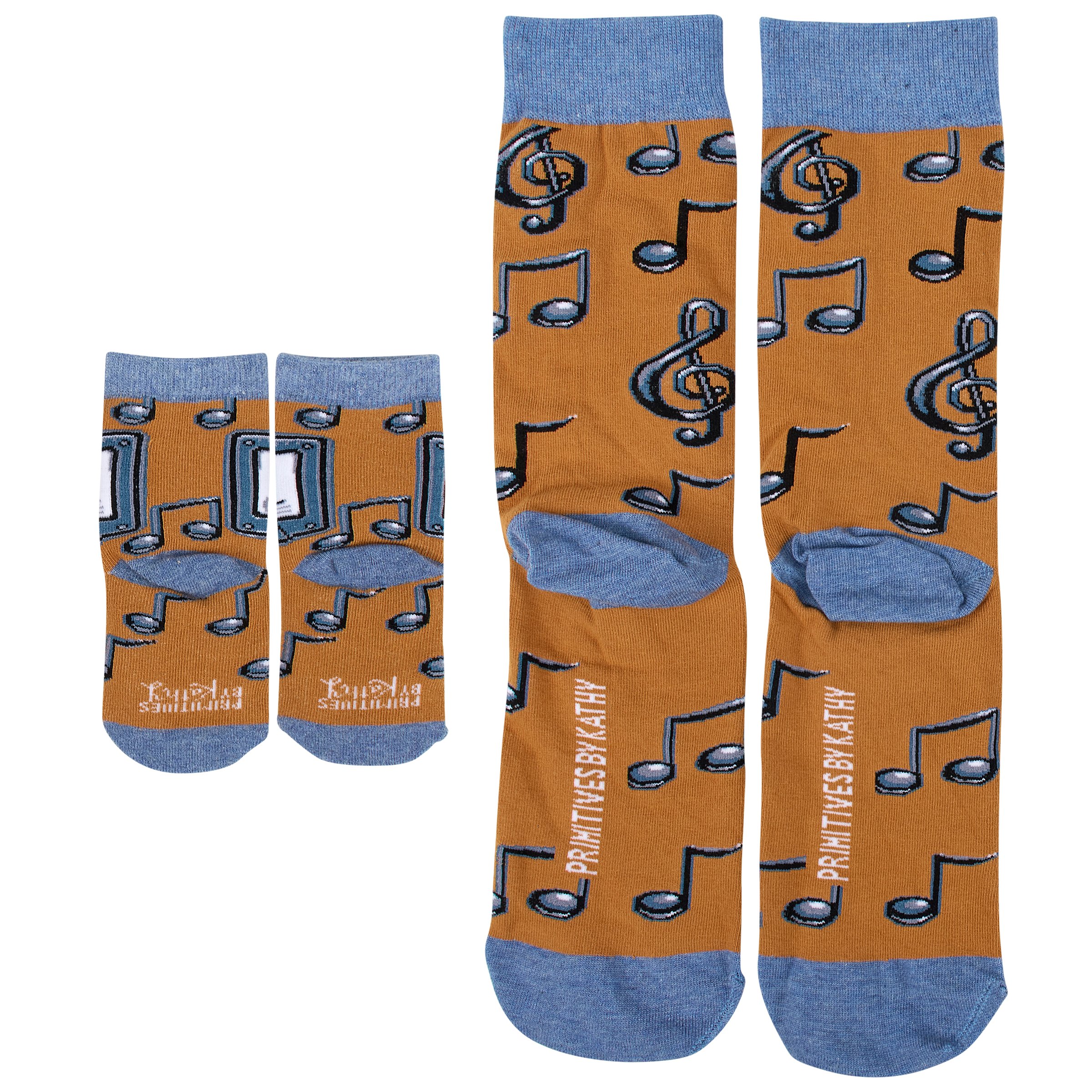 A fun baby & me gift set from our LOL-Made You Smile Collection featuring colorful pairs of matching socks that include one adult pair and one baby pair to create fun family moments. Each pair displays playful hand illustrated music notes with fun music inspired sentiments on cassette tape designs that read "Original" on the adult socks and "Remix" on the baby socks. This giftable sock set is made with a cotton, nylon, and spandex blend for a one size fits most design for the adult pair and baby socks that fit 0-12 months. Our Original/Remix baby & me sock set comes packaged together with a decorative header card making it great for gifting as well as a clear plastic hanger for easy rack display. A fun baby & me matching sock set perfect to give as a music-themed gift for baby showers or everyday moments.