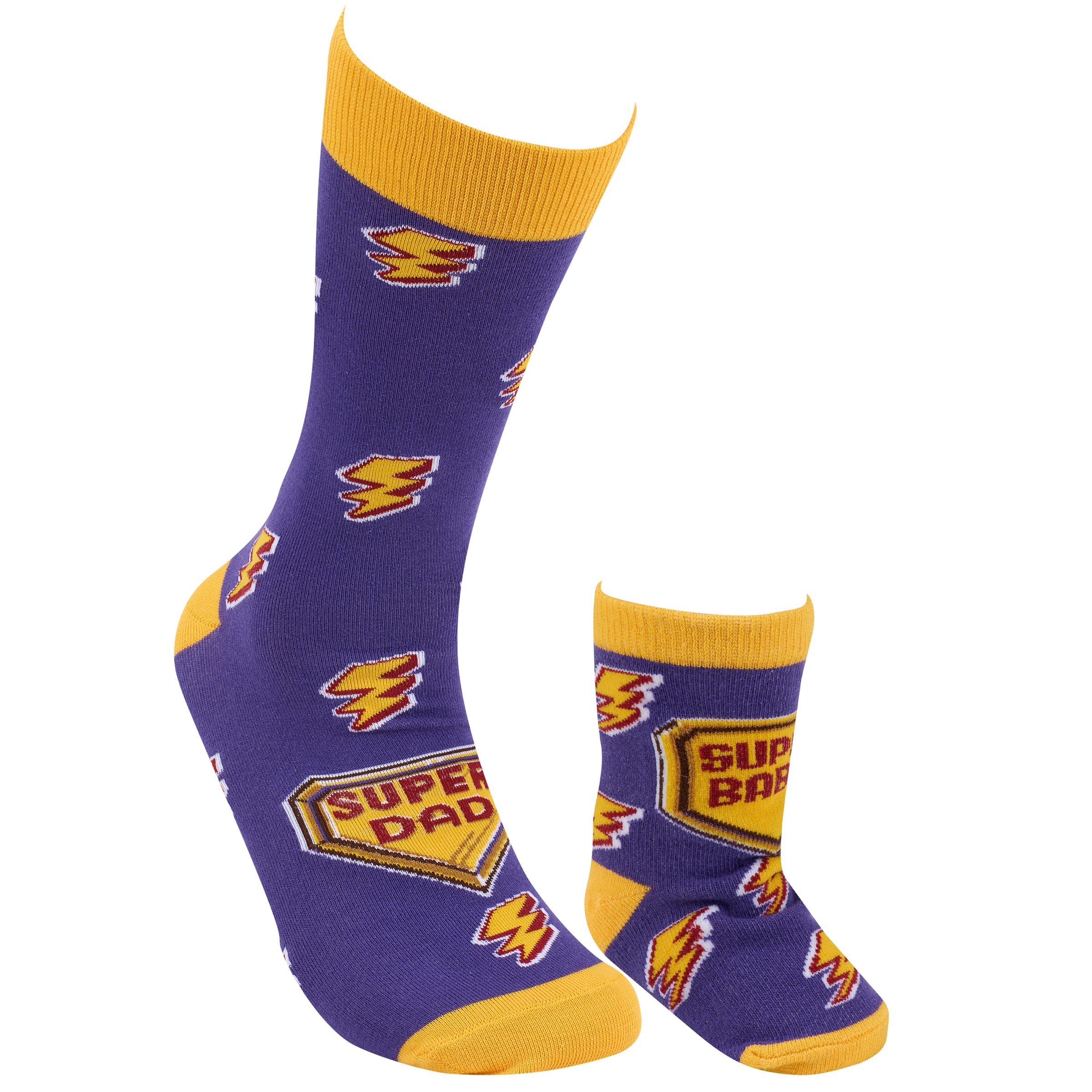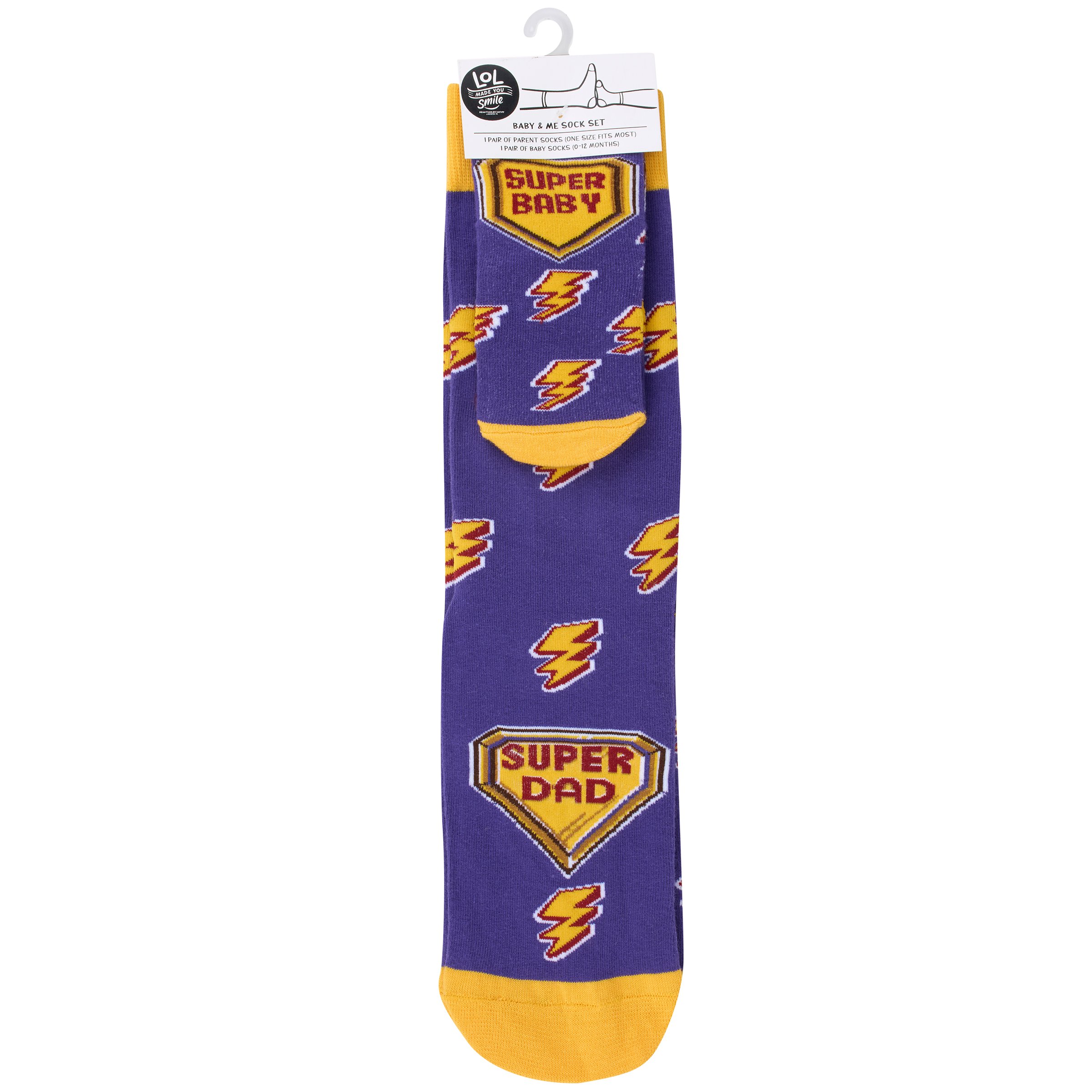 A fun baby & me gift set from our LOL-Made You Smile Collection featuring colorful pairs of matching socks that include one adult pair and one baby pair to create fun family moments. Each pair displays playful hand illustrated superhero designs with fun dad inspired sentiments that read "Super Dad" on the adult socks and "Super Baby" on the baby socks. This giftable sock set is made with a cotton, nylon, and spandex blend for a one size fits most design for the adult pair and baby socks that fit 0-12 months. Our Super Dad baby & me sock set comes packaged together with a decorative header card making it great for gifting as well as a clear plastic hanger for easy rack display. A cute baby & me matching sock set perfect to give as a family gift for baby showers or Father's Day.