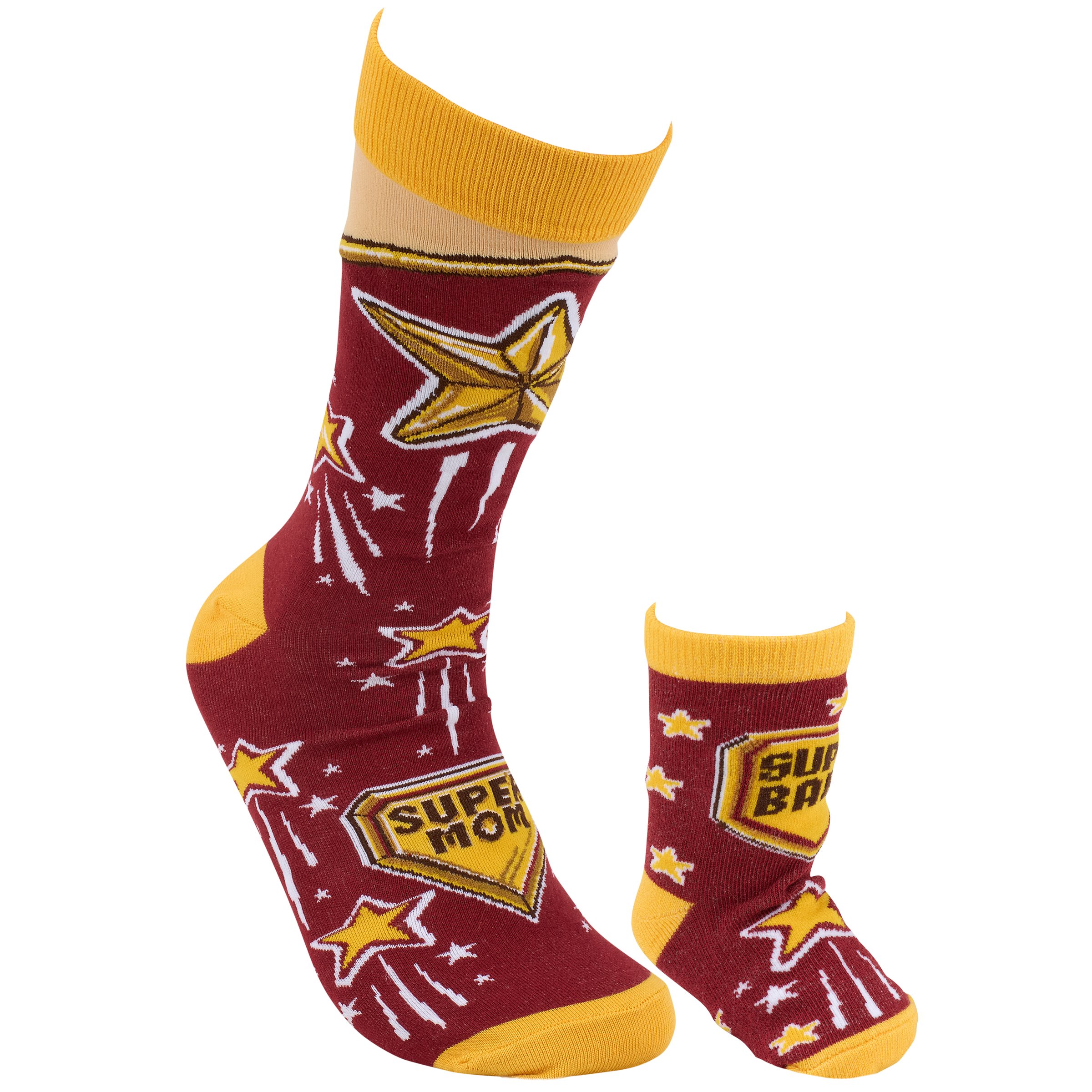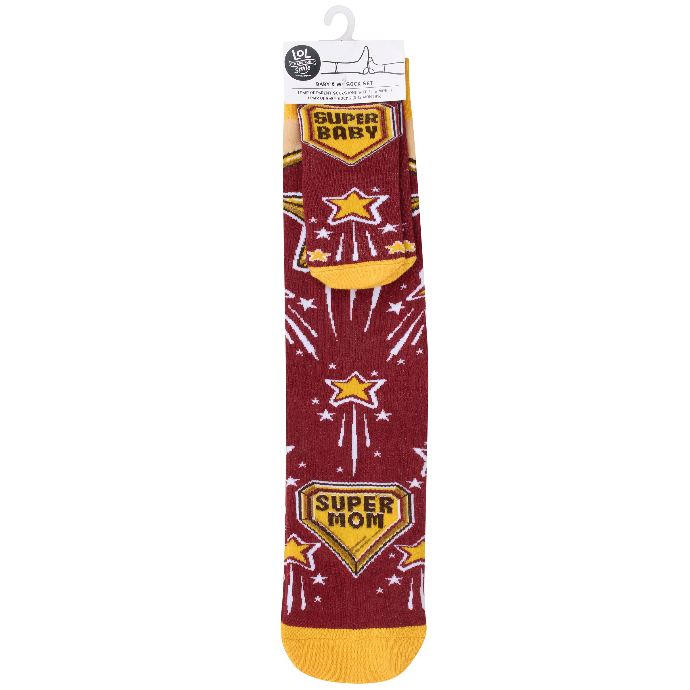 A fun baby & me gift set from our LOL-Made You Smile Collection featuring colorful pairs of matching socks that include one adult pair and one baby pair to create fun family moments. Each pair displays playful hand illustrated superhero designs with fun mom inspired sentiments that read "Super Mom" on the adult socks and "Super Baby" on the baby socks. This giftable sock set is made with a cotton, nylon, and spandex blend for a one size fits most design for the adult pair and baby socks that fit 0-12 months. Our Super Mom baby & me sock set comes packaged together with a decorative header card making it great for gifting as well as a clear plastic hanger for easy rack display. A cute baby & me matching sock set perfect to give as a family gift for baby showers or Mother's Day.