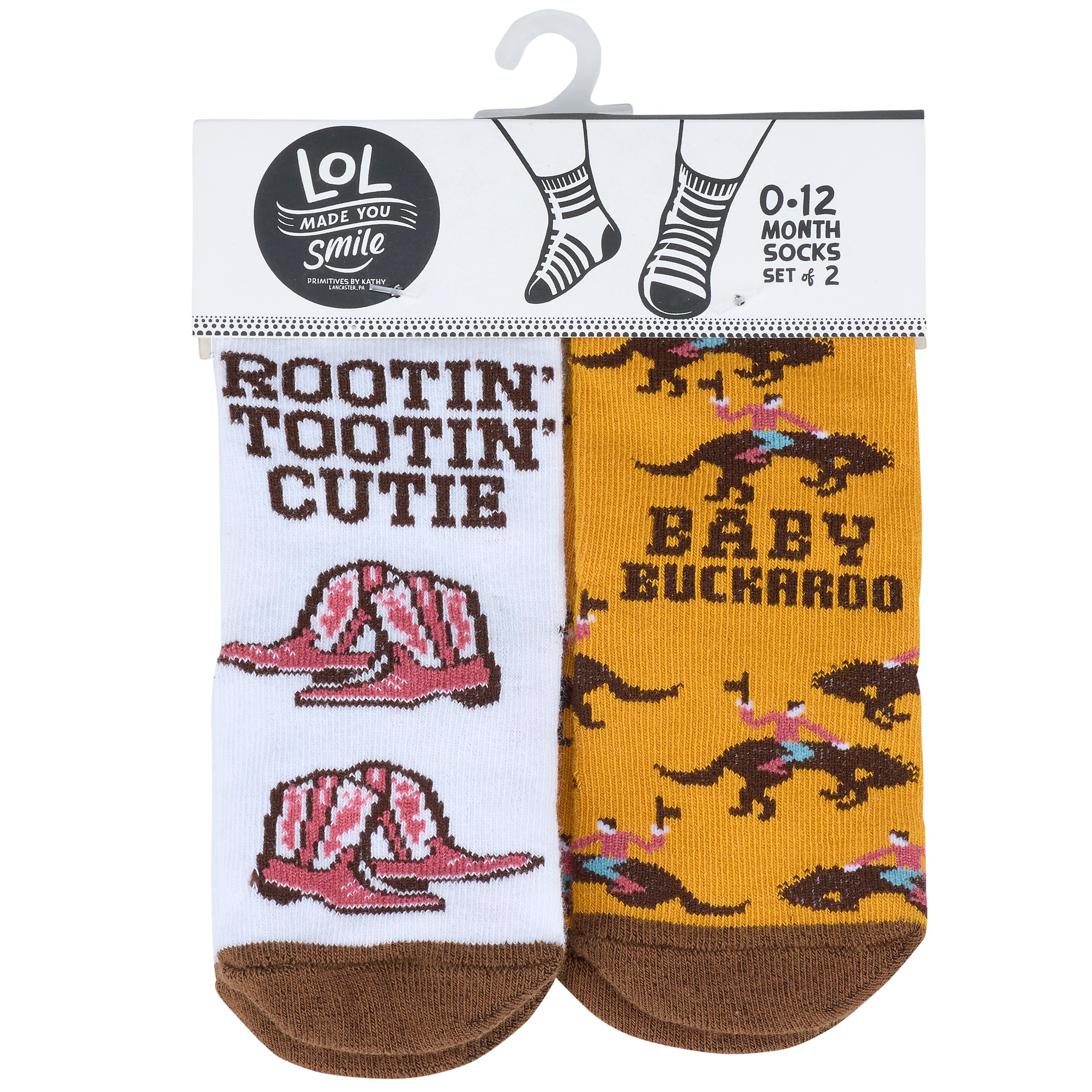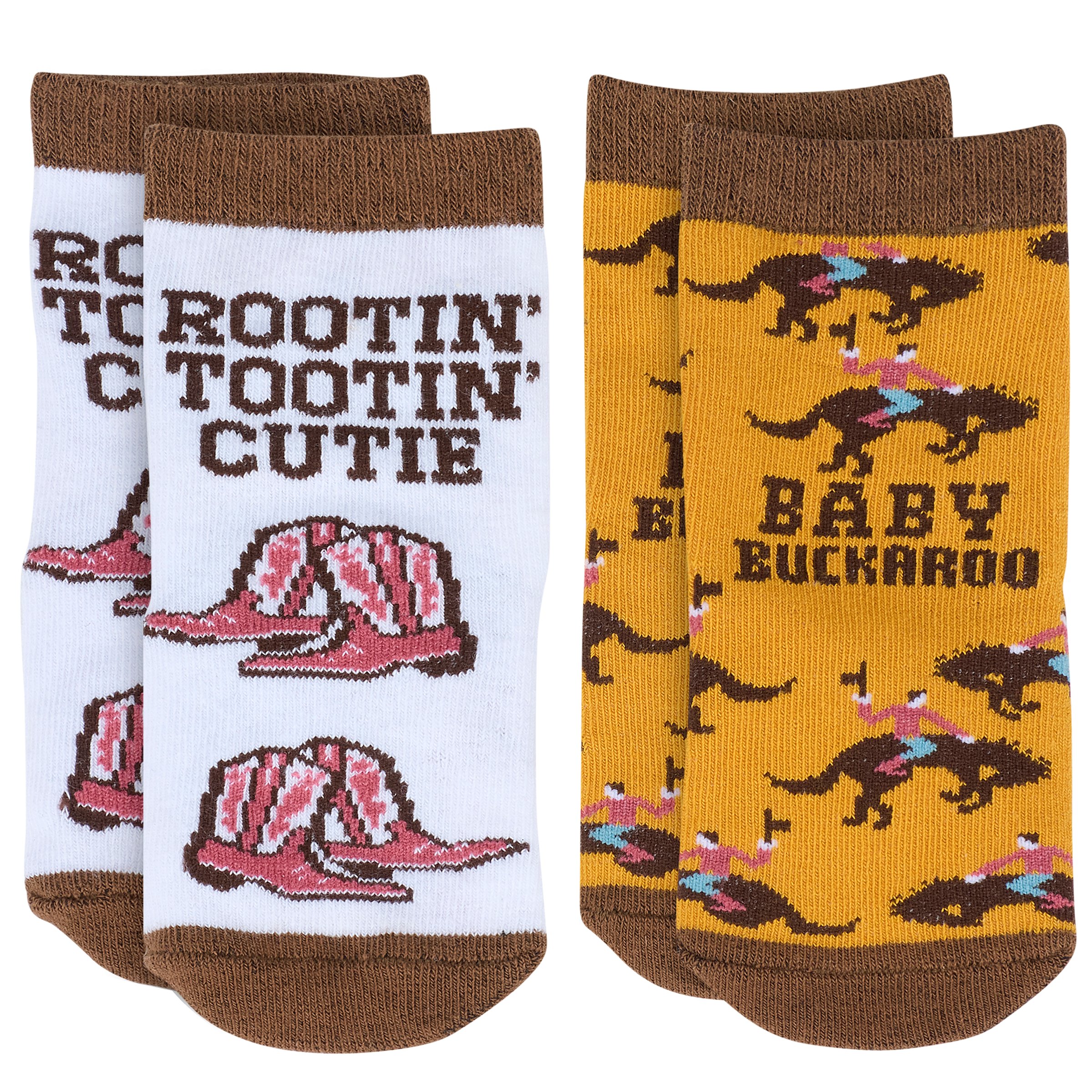 Two pairs of cozy baby socks in a giftable set from our Baby & Kids Collection displaying fun western inspired designs on each pair. Baby socks feature cowboy boot designs with "Rootin' Tootin' Cutie" sentiment on the front as well as a pattern of cowboys riding horses with "Baby Buckaroo" sentiment. Both baby sock designs are replicated from original hand illustrated art. Socks are sized to fit a 0-12 month baby and made with a cotton, nylon, and spandex blend for a snug fit. Our Baby Buckaroo baby sock set comes packaged together on a decorative header card making it great for gifting with a clear plastic hanger displaying both sock designs for easy rack display. A fun western-themed gift for baby showers or everyday moments.