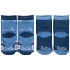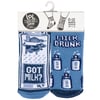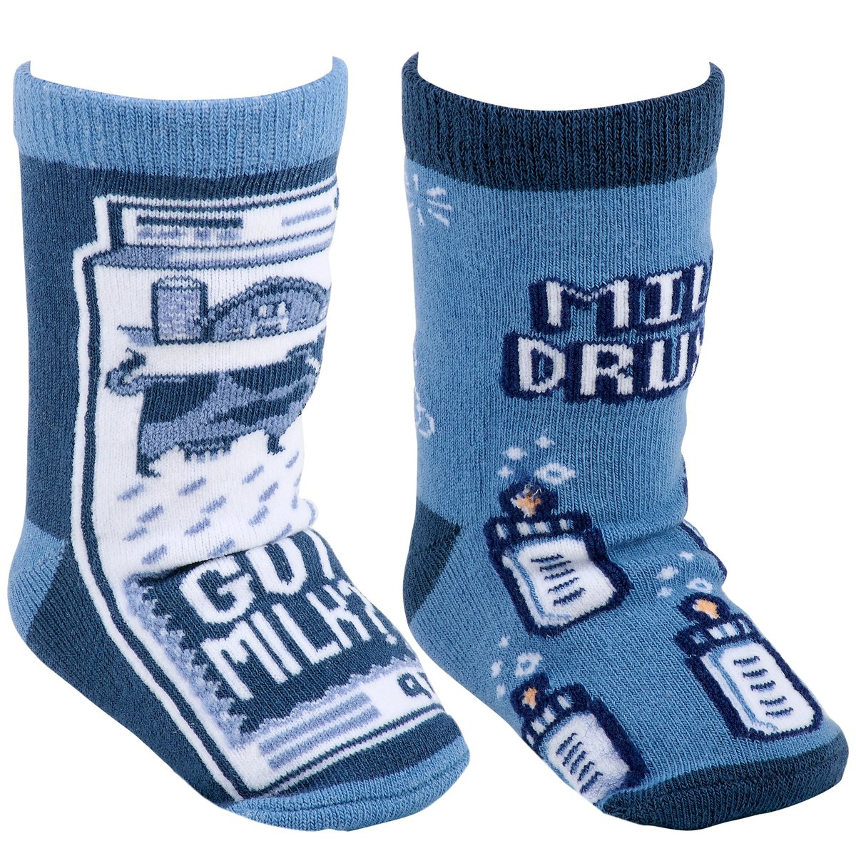 Two pairs of cozy baby socks in a giftable set from our Baby & Kids Collection displaying funny milk-themed designs on each pair. Baby socks feature a fun milk carton design with "Got Milk?" sentiment as well as a pattern of baby bottles with fun sentiment that reads "Milk Drunk." Both baby sock designs are replicated from original hand illustrated art. Socks are sized to fit a 0-12 month baby and made with a cotton, nylon, and spandex blend for a snug fit. Our Got Milk baby sock set comes with a header card and a clear plastic hanger displaying both sock designs for easy rack display. A fun gift for baby showers or everyday moments.