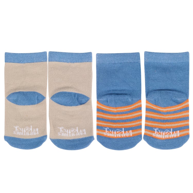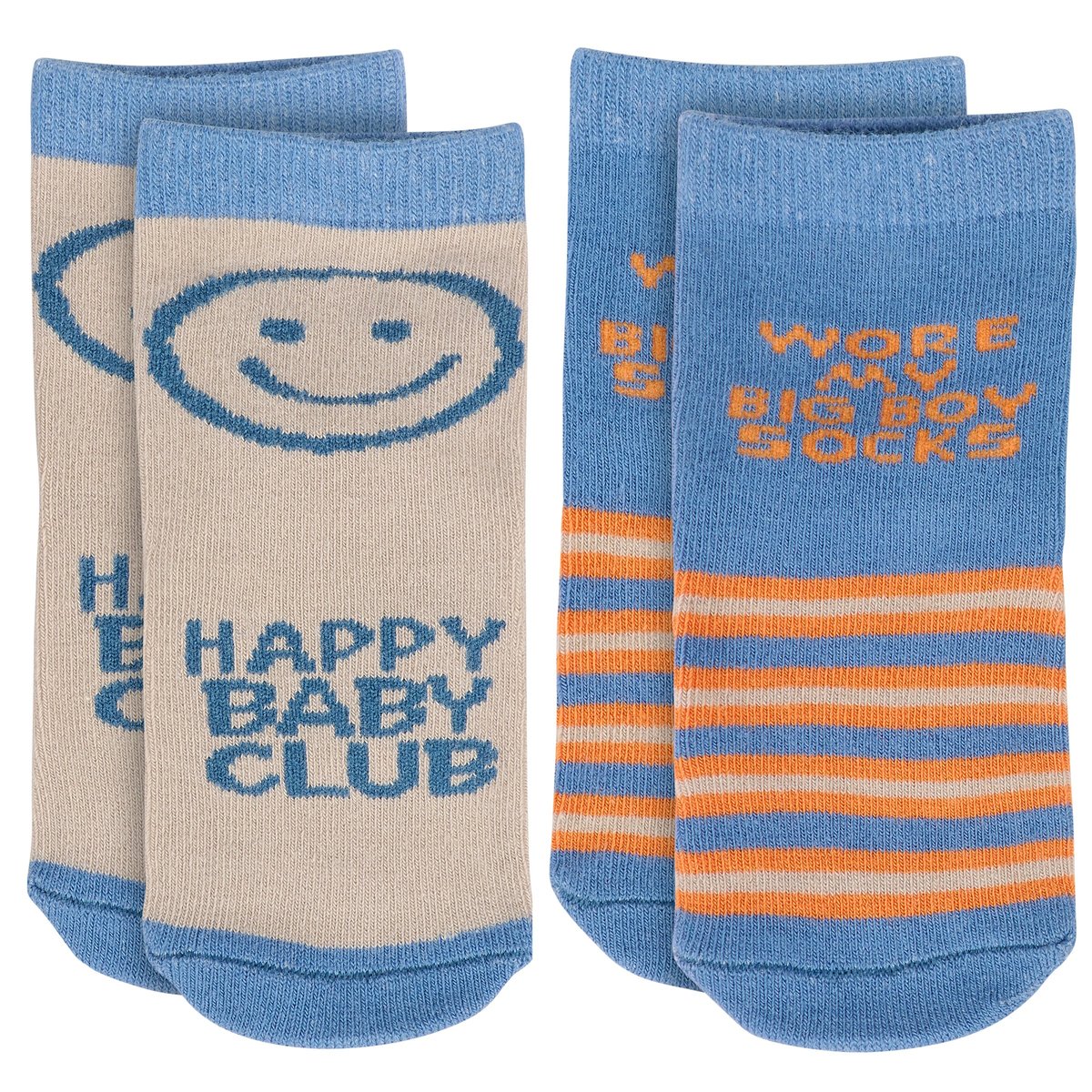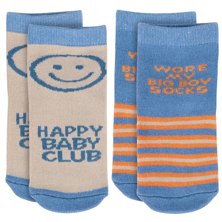 Two pairs of cozy baby socks in a giftable set from our Baby & Kids Collection displaying fun baby inspired designs on each pair. Baby sock designs feature a smiley face with "Happy Baby Club" sentiment as well as a stripe pattern with a fun sentiment that reads "Wore My Big Boy Socks." Socks are sized to fit a 0-12 month baby and made with a cotton, nylon, and spandex blend for a snug fit. Our Happy Baby Club baby sock set comes with a header card and a clear plastic hanger displaying both sock designs for easy rack display. A fun gift for baby showers or everyday moments.