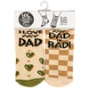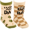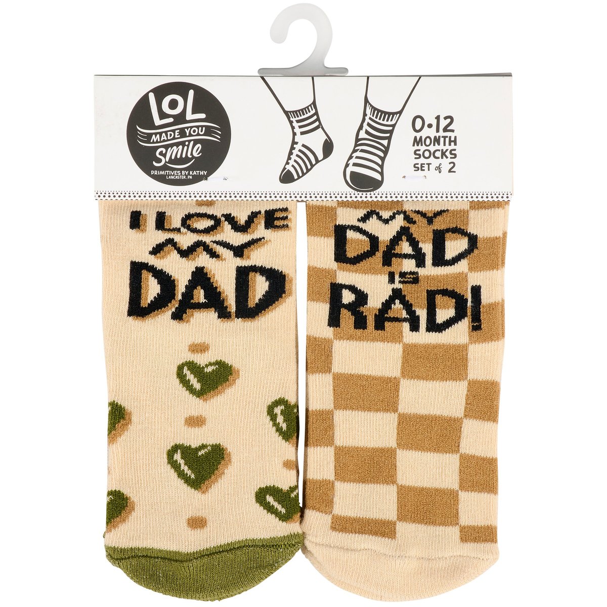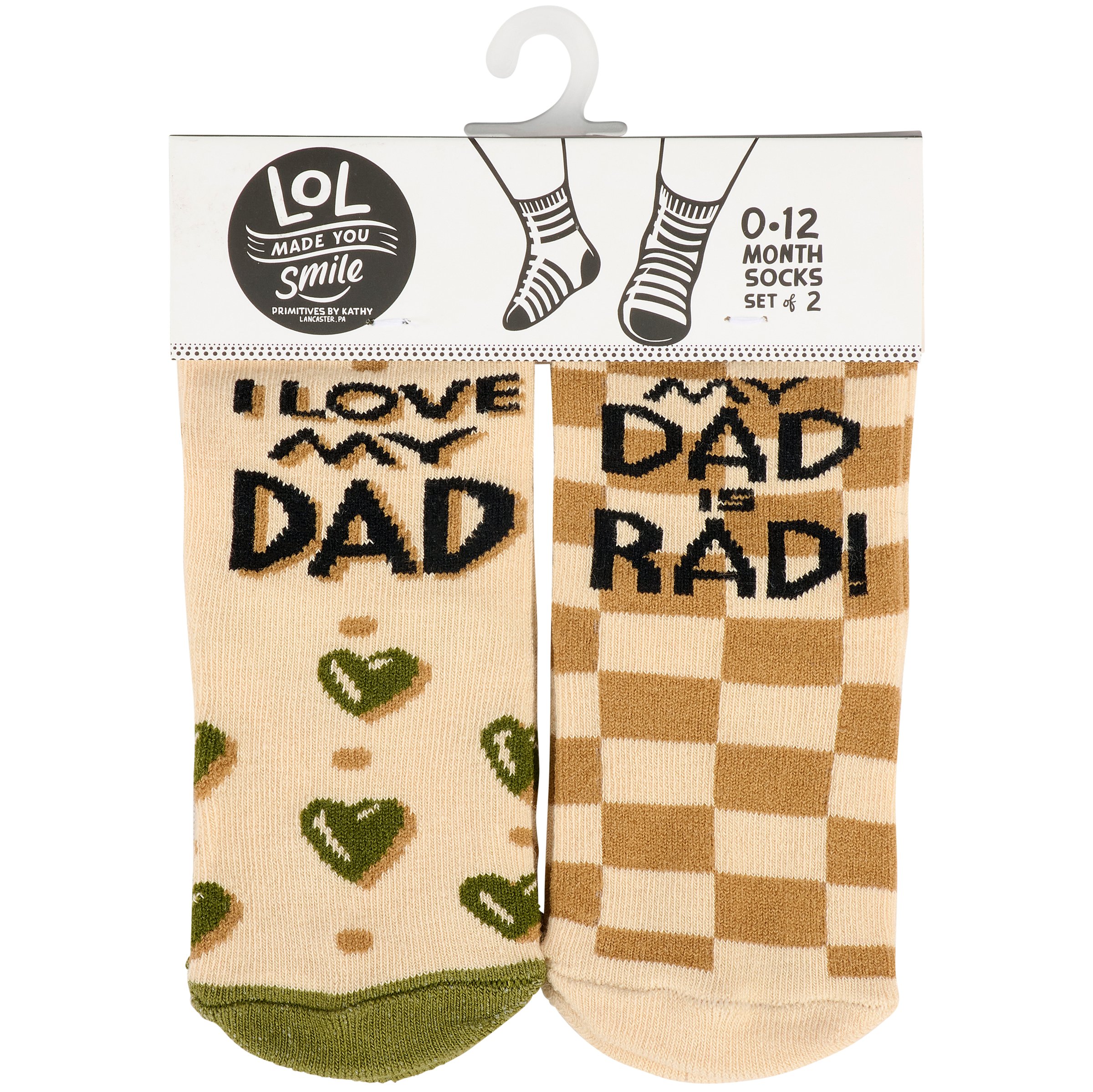 Two pairs of cozy baby socks in a giftable set from our Baby & Kids Collection displaying fun dad inspired designs on each pair. Baby sock designs feature a pattern of charming hearts with a heartwarming sentiment that reads "I Love My Dad" as well as a checkered pattern with a fun sentiment that reads "My Dad Is Rad!" Socks are sized to fit a 0-12 month baby and made with a cotton, nylon, and spandex blend for a snug fit. Our My Dad Is Rad baby sock set comes with a header card and a clear plastic hanger displaying both sock designs for easy rack display. A fun dad-themed gift for baby showers or everyday moments.