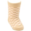 Three pairs of cozy baby socks in a giftable set from our Baby & Kids Collection displaying charming pet inspired designs on each pair. Baby sock designs include a dog with dog bones, a cat with cat toys, and an all-over checkered pattern replicated from original block print style art. Socks are sized to fit a 6-12 month baby and made with cotton, nylon, and spandex for a snug fit. Our Pets baby sock set comes with a header card and a clear plastic hanger displaying all three sock designs. A cute pet-themed gift for baby showers or everyday moments.