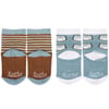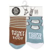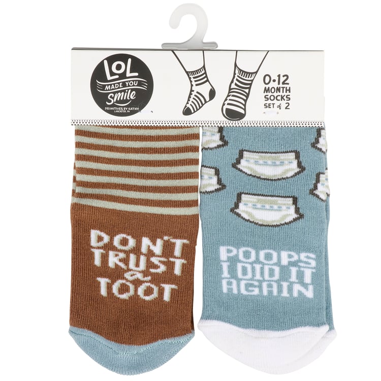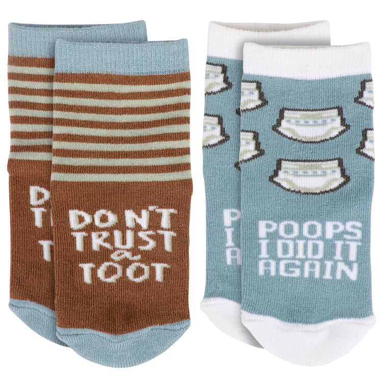 Two pairs of cozy baby socks in a giftable set from our Baby & Kids Collection displaying fun designs on each pair. Baby sock designs feature a stripe pattern with funny sentiment that reads "Don't Trust A Toot" as well as a pattern of diapers with a funny sentiment that reads "Poops I Did It Again." Socks are sized to fit a 0-12 month baby and made with a cotton, nylon, and spandex blend for a snug fit. Our Poops I Did It Again baby sock set comes with a header card and a clear plastic hanger displaying both sock designs for easy rack display. A fun gift for baby showers or everyday moments.