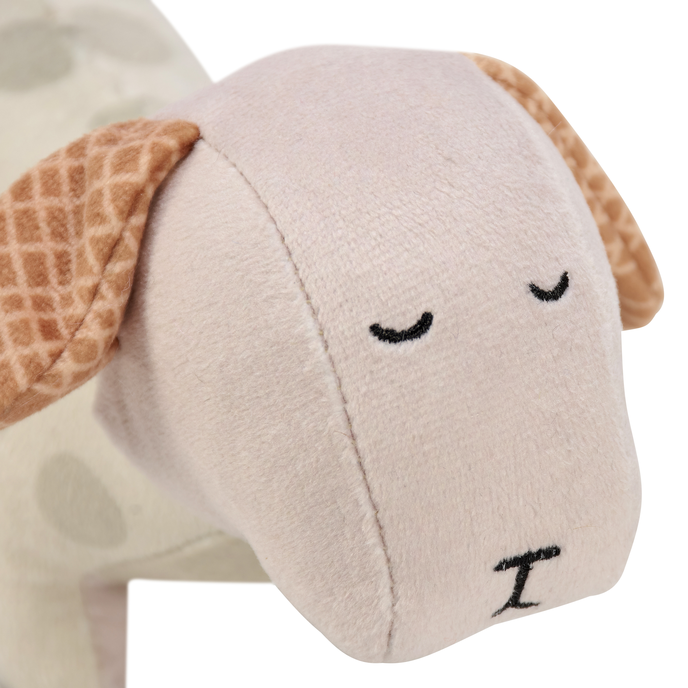 A soft plush toy from our Baby & Kids Collection displaying a charming dog design replicated from original block print style art. Dog baby toy features engaging sensory elements that encourage touch and play including a squeaker, soft ears, and embroidered details for the face. Our Squeaky Dog baby toy is perfect for play with children 9 months or older and displays nicely on the shelf as child's room décor when not in use. A cute pet-themed gift for baby showers or everyday moments. WARNING: To prevent suffocation, do not put in a crib or near an area where an infant may sleep.